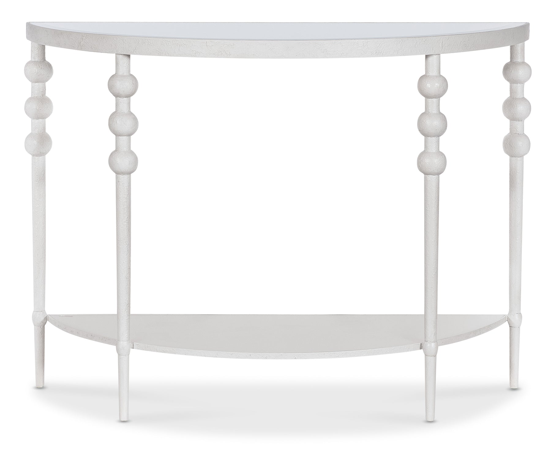 This half-moon console table offers soft sophistication with its white textured finish and beveled white-glass top. A single lower shelf enhances its utility, while the demilune shape makes it ideal for narrow spaces.