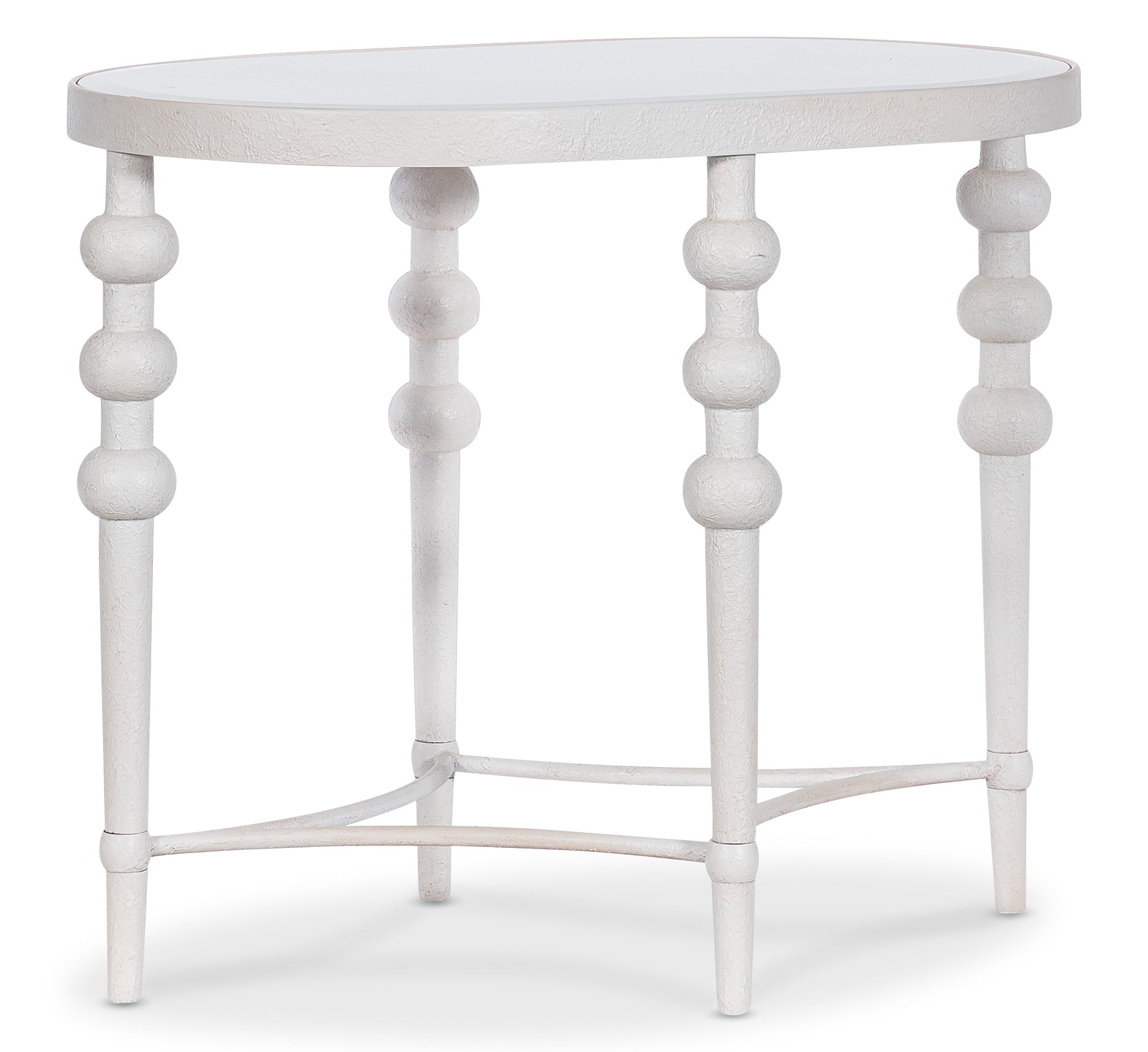 With its white textured finish and beveled glass inset, this oval end table brings light and elegance to your décor. Ideal for minimalist or coastal-inspired spaces.