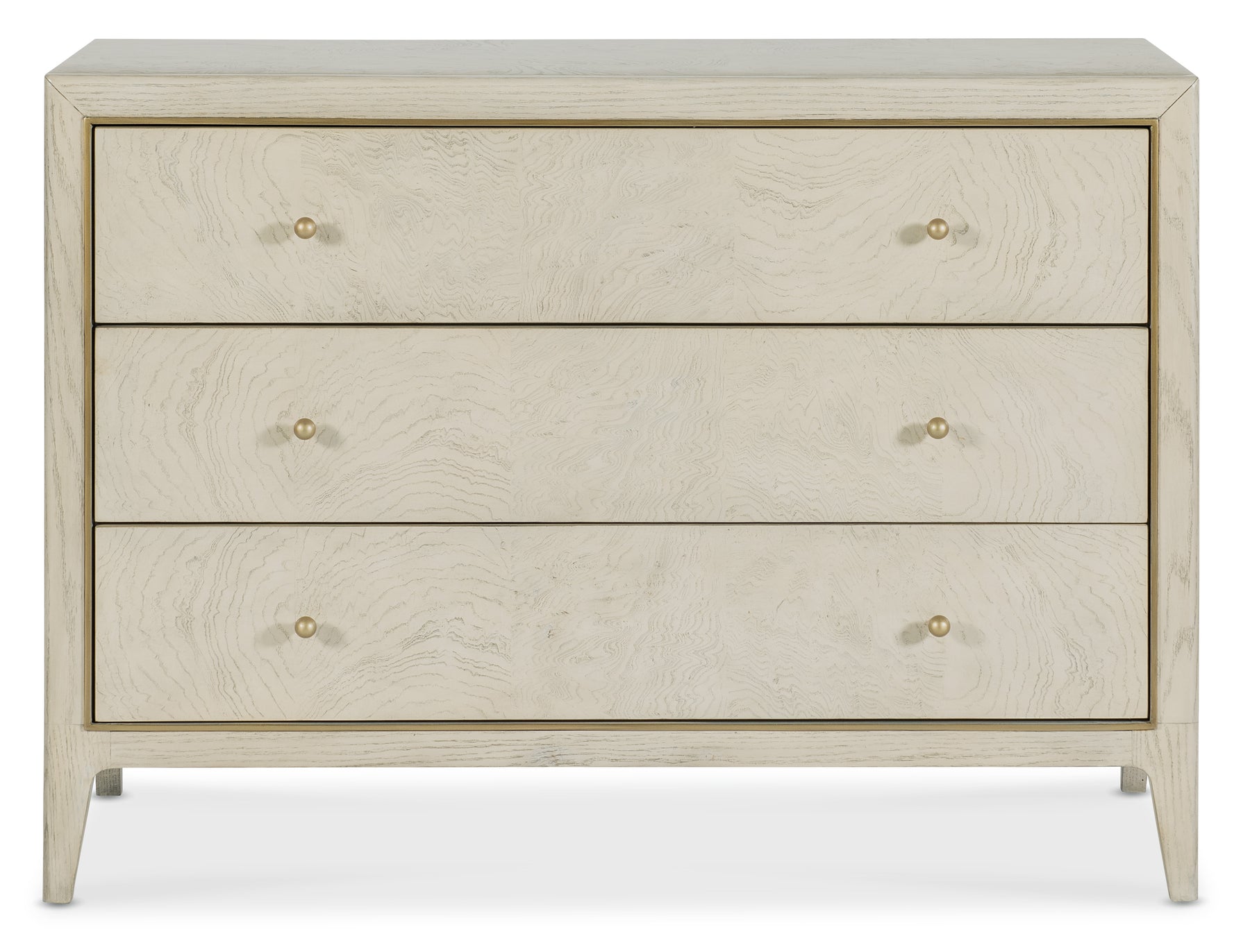 A blend of romantic curves and refined finishes, the Wanderlust Chest is crafted from ash burl veneers in a light greige hue, accented by gold trim and tapered legs. Three self-close drawers make it as practical as it is beautiful.