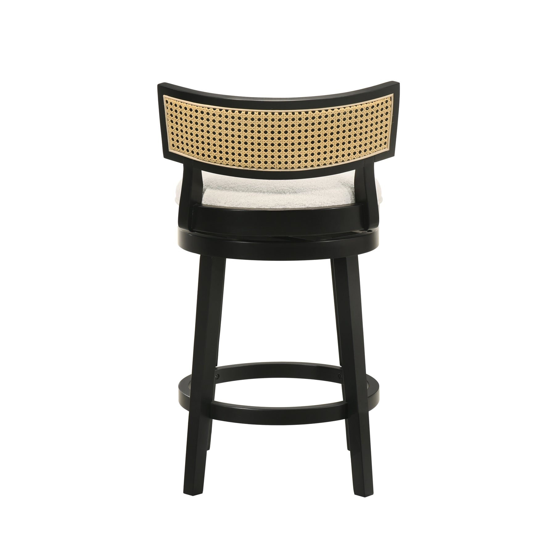 The Noely Barstool Collection blends soft texture, refined geometry, and functional versatility into a design that elevates any dining or entertaining space. Its contemporary silhouette, featuring a low curved backrest inset with plush boucle upholstery, brings a polished yet welcoming character to the modern home. The stool’s round cushioned seat and smooth 360-degree swivel base offer effortless comfort, making it as practical as it is visually sophisticated. Each Noely stool is crafted from durable solid natural wood, chosen for its balance of strength, density, and smooth finish. The frame is available in two striking finishes — Amber Glow, which enhances the natural warmth of the wood, and Black, offering a sleek contrast for more modern interiors. These finishes complement the White Boucle performance fabric, creating a textural harmony that suits both minimalist and transitional decor themes. The boucle’s subtle weave catches light softly, delivering an inviting aesthetic that feels luxurious yet understated. Designed with ergonomic comfort in mind, the Noely stool features a low-profile, wraparound backrest that supports natural posture while maintaining an open, airy look. The padded seat is generously filled with high-density foam, ensuring lasting resilience and comfort for extended sitting. The 360-degree swivel mechanism allows users to move freely — perfect for kitchen islands, conversation areas, or open-concept living spaces where flexibility matters. The sturdy leg design includes angled supports and an integrated circular footrest ring, reinforcing stability and balance while providing a relaxed seating posture. Every element of Noely is refined for real-world use — the performance fabric resists stains and fading, maintaining its soft texture and fresh appearance through everyday wear. Offered in counter height and bar height, the Noely stool adapts easily to varied countertop configurations. Assembly is quick and straightforward, with pre-drilled components and hardware included. Backed by a 1-year limited manufacturer warranty, Noely delivers the perfect blend of timeless craftsmanship and everyday comfort — a functional statement piece designed for modern lifestyles.