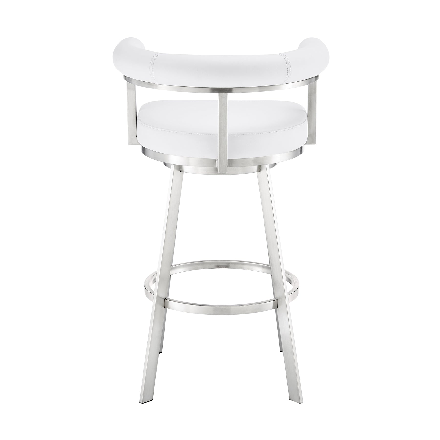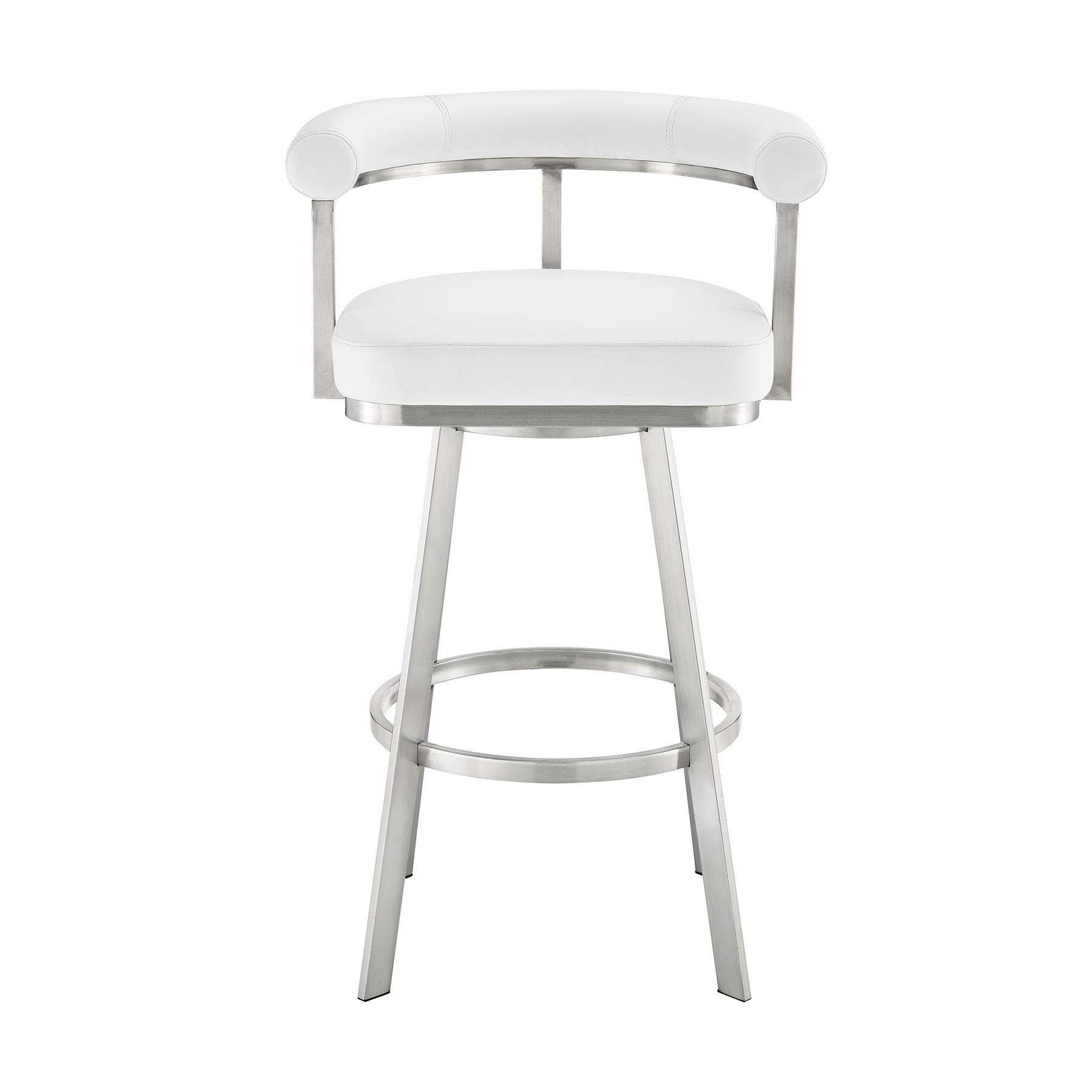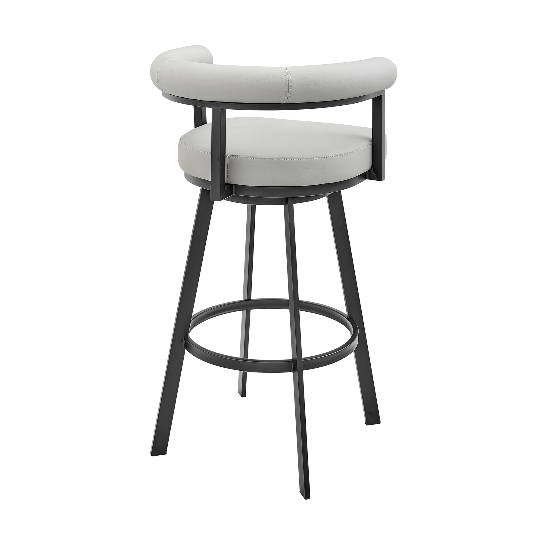 Glam up your space with the flair of our Nolagam swivel bar or counter stool in faux leather and metal from Armen Living. Featuring a minimal and streamlined barrel back, our mid-century modern counter stool vouches for a sleek and inviting look. The plush cushioning at the back and the padded seat offers a comfortable seat while the open back allows for breathability. Uplifted with a chic metal frame, our stylish counter or barstool makes a powerful design statement. Upholstered in faux leather, it provides a comfortable stay at a high dining area, kitchen counter, or worktable. Faux leather does not crack easily and is stain resistant, does not fade easily and is also UV resistant. Counter or bar height stools that feature a swivel mechanism tend to be much more convenient for everyday use or when entertaining. The wonderful full 360-degree swivel function allows for maximum mobility. The smooth glide swivel function allows you to change directions with ease, making this your new favorite seat in your home. The Nolagam faux leather and metal kitchen barstool is available in your choice of a black finish with brown or gray faux leather, a brushed stainless-steel finish with your choice of black, light gray, or white faux leather, or a java brown finish with chocolate faux leather upholstery. This barstool is available in 26-inch or 30-inch seat heights options.