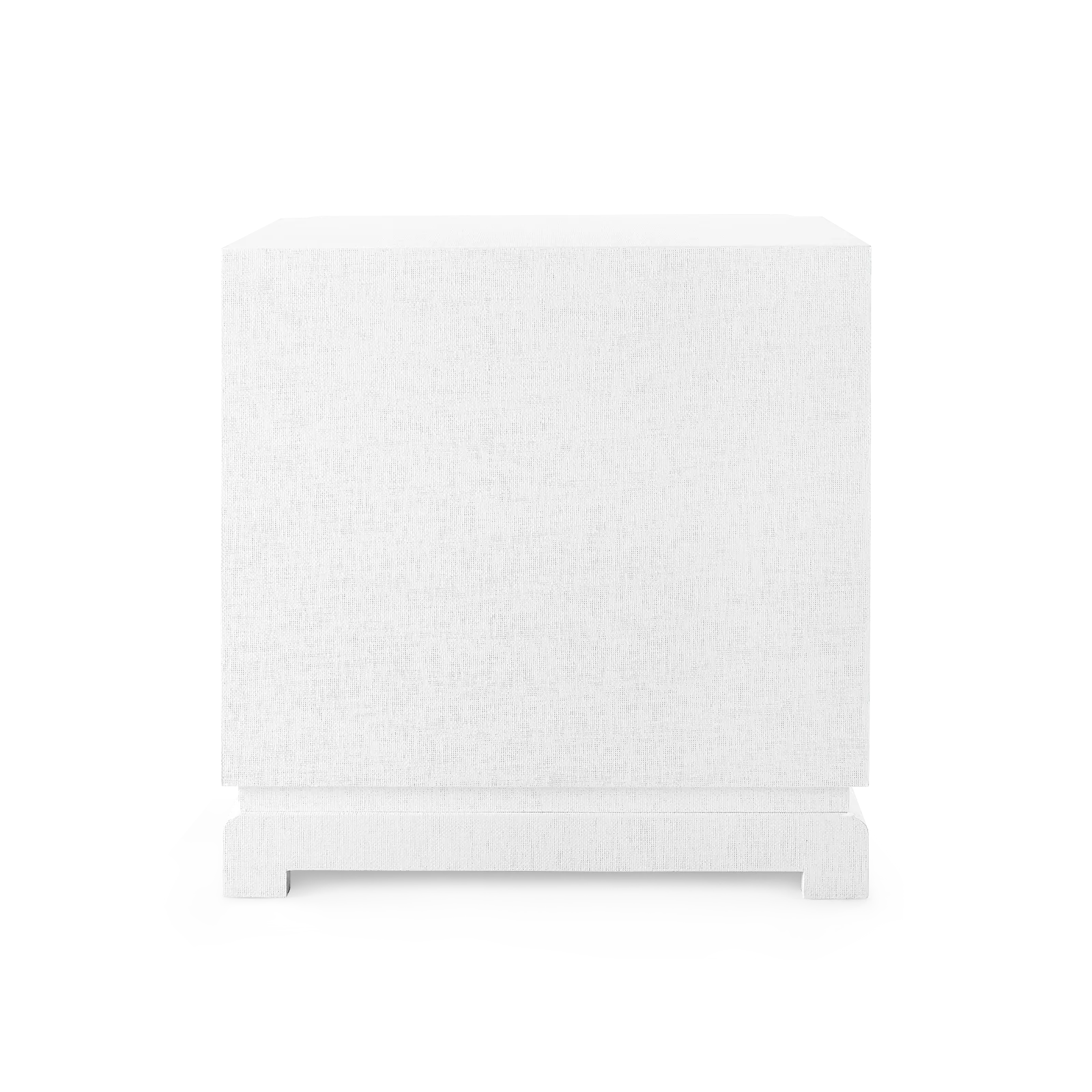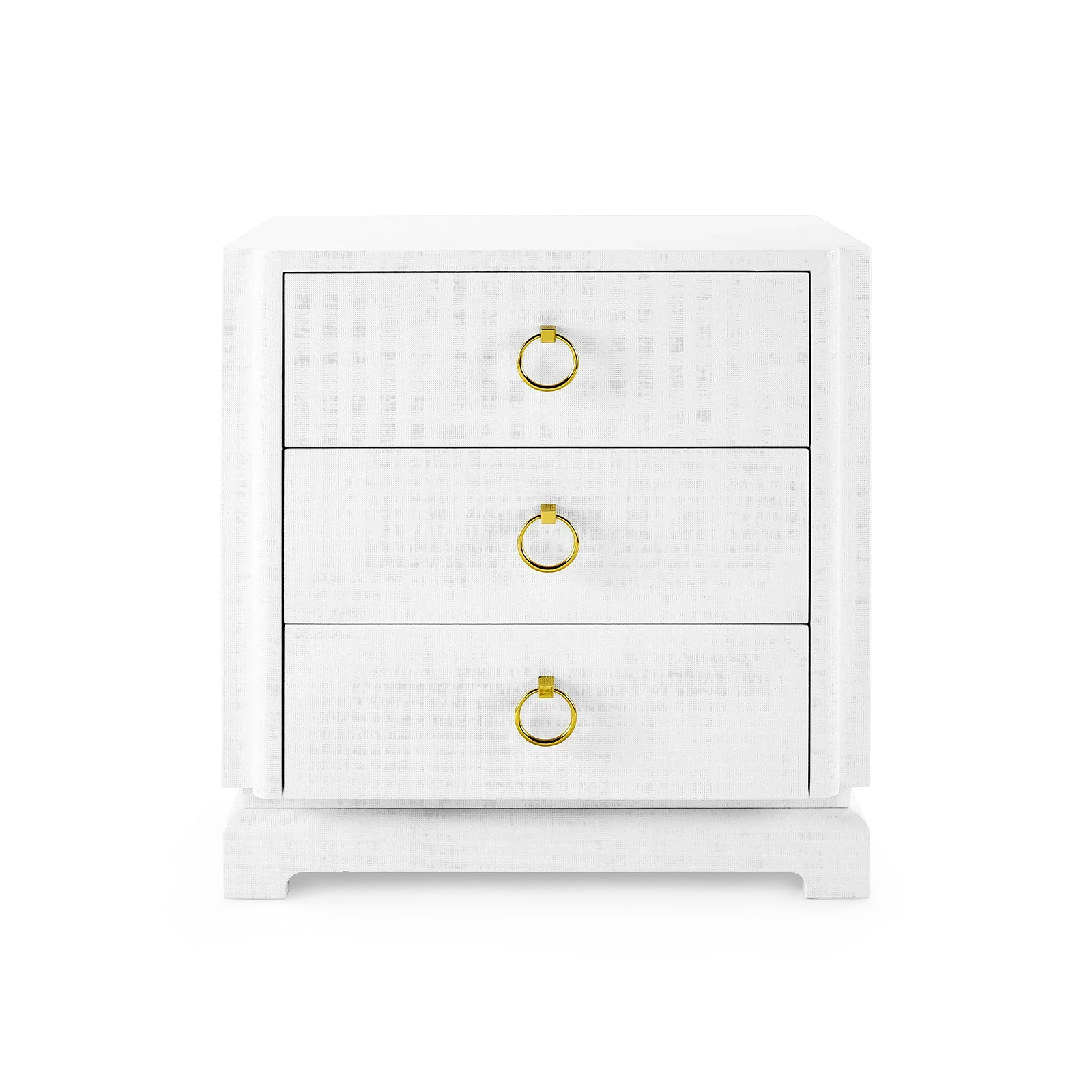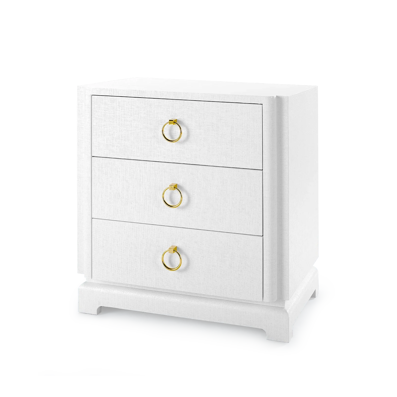 Why shouldn’t “functional” and “fabulous” appear in the same sentence? The Pavel 3-Drawer Side Table does it all. A storage solution with undeniable style, this classic piece finds upgraded refinement in its Art Deco details and glamorous accents. Inset borders and gracefully curved edges give the Pavel an elegant silhouette, while the subtle projection of its three-drawer facade lends itself to the piece’s unique play on perspective and dimension. Each softly gliding drawer boasts stained interiors and a glittering gold ring pull. The gorgeously constructed furnishing is wrapped in lightly textured lacquered grasscloth and coated in a chic white finish. From traditional spaces to more modern, minimalist schemes, the Pavel is as luxurious as it is adaptable.