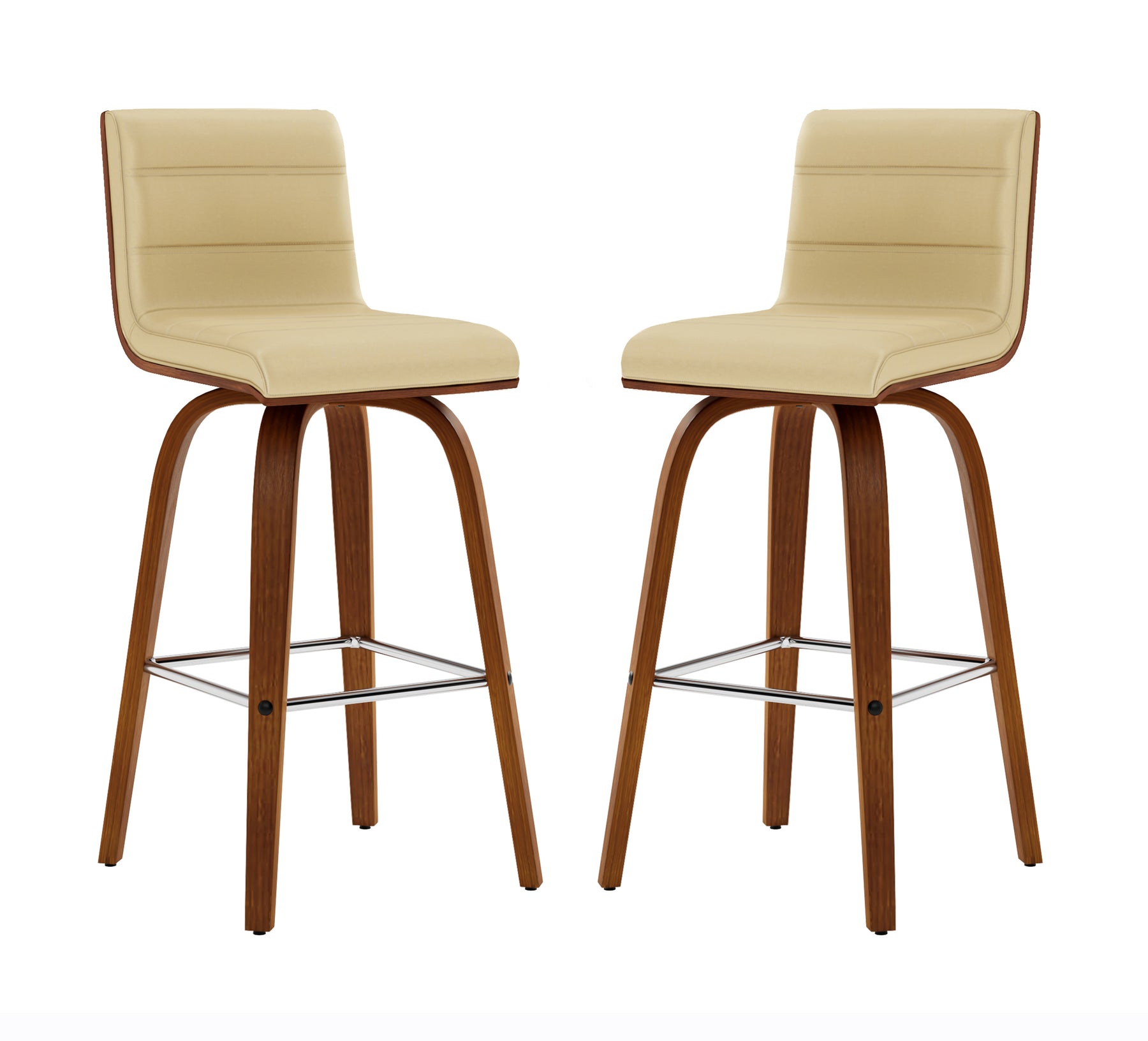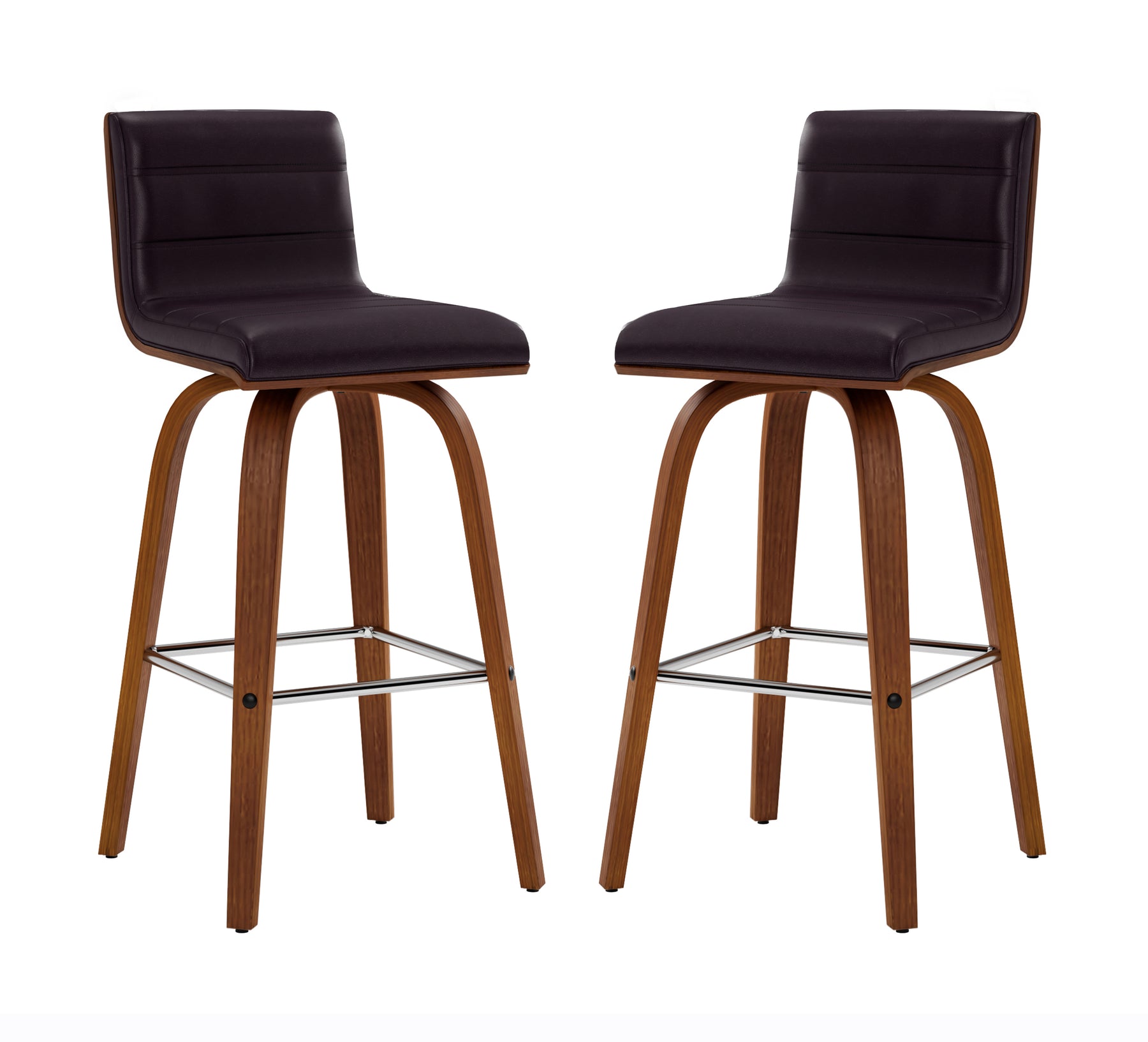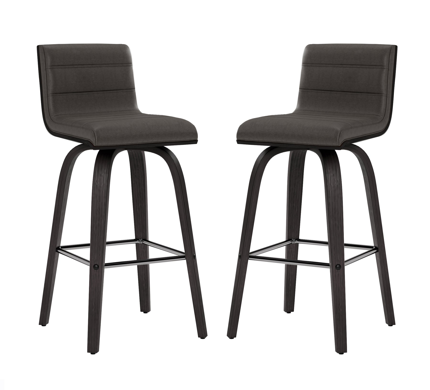 Elevate your space with the classic and sophisticated Vienna Swivel Faux Leather and Wood Counter or Bar Stool by Armen Living. This sleek and versatile barstool seamlessly combines style and comfort with its Mid-Century Modern design, effortlessly integrating into your home's existing decor. With the 360-degree swivel function, you and your guests have optimal mobility for staying engaged, regardless of your place in the room at any party and gathering. The sturdy frame is constructed with four robust wooden legs, elegantly accentuated by a plush, high-density foam cushion enveloped in high-grade faux leather upholstery. A square, steel footrest adds a touch of chic style without compromising practicality. The soft faux leather upholstery makes the Vienna and ideal choice for any entertaining home! With its two seat height options and armless design, you can the Vienna easily complements your kitchen island, peninsula counter, or home bar. The padded backrest, designed with ergonomic properties, ensures both comfort and proper alignment during use. Ideal for any home or apartment, the Vienna promises enduring comfort with its quality materials, guaranteeing a stylish and comfortable seat for years to come. Choose from the Vienna Counter or Bar Stool in 26” or 30” seat height, available in either a black wood finish with gray faux leather or a walnut wood finish with cream, gray, or brown faux leather to suit your individual taste and enhance your space.