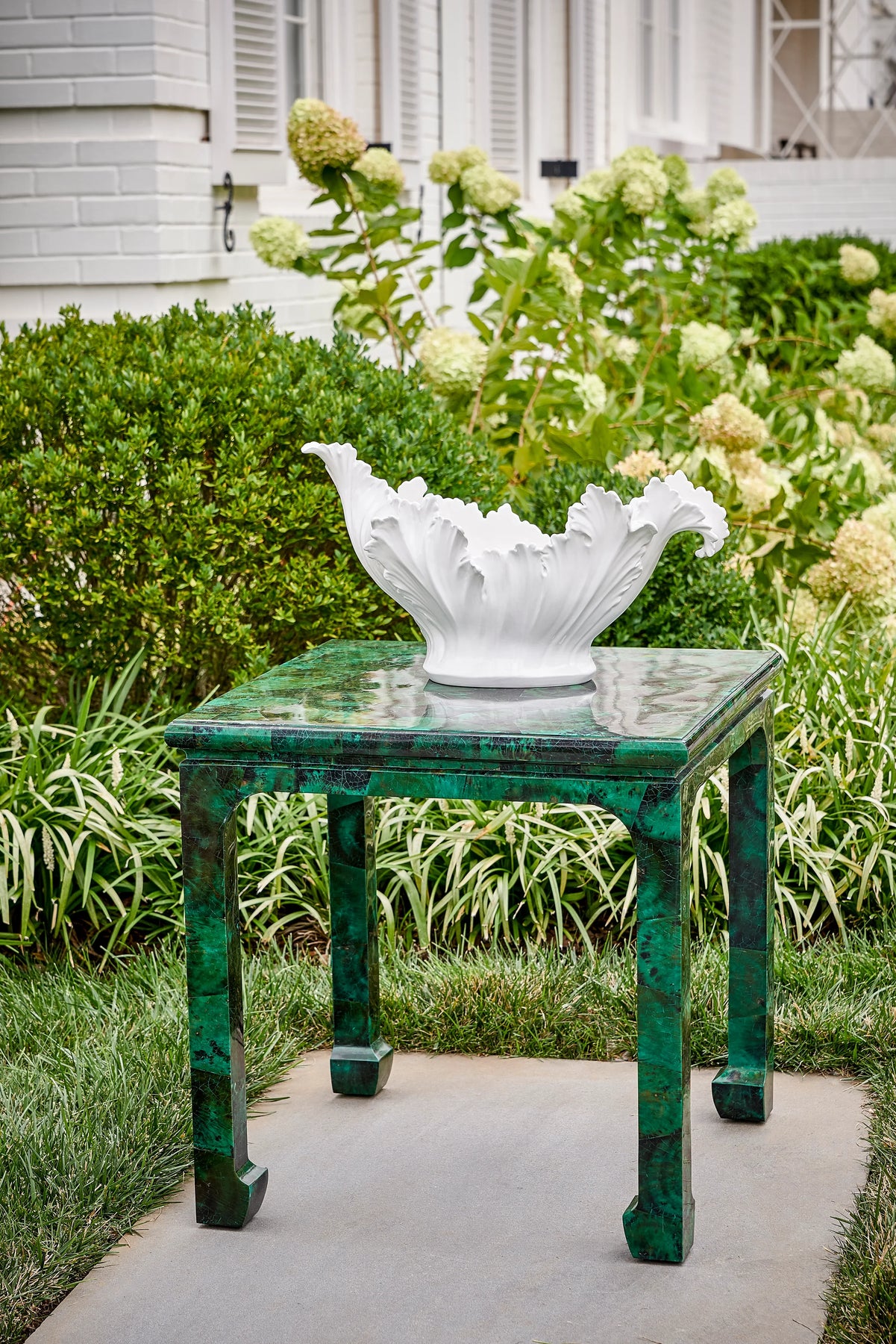 Ancanthus Leaf Bowl is one of our most versatile bowls. This glossy white hand painted Italian ceramic bowl features a layer of detailed acanthus leaves. Its simple color yet elegant design is ideal for use as a stand alone accent on a tabletop or bookcase in any decorative style. However, it can also be used to hold fruit, decorative orbs or a dried arrangement for a stunning centerpiece or even add ice and use as an exquisite wine chiller at your next garden party. Made in Italy.