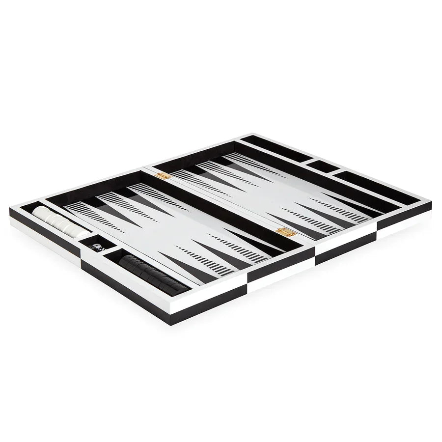 Our Op Art Backgammon Set elevates your evening entertainment. Glam and glossy, high-contrast lacquer turns this preppy pastime into Pop Art. Black and white never goes out of style, and you'll never want this game out of your sight. Leave it open to reveal its mind-bendingly modernist board, or close it for a chic cocktail table accent. The perfect gift for a bold bon vivant.