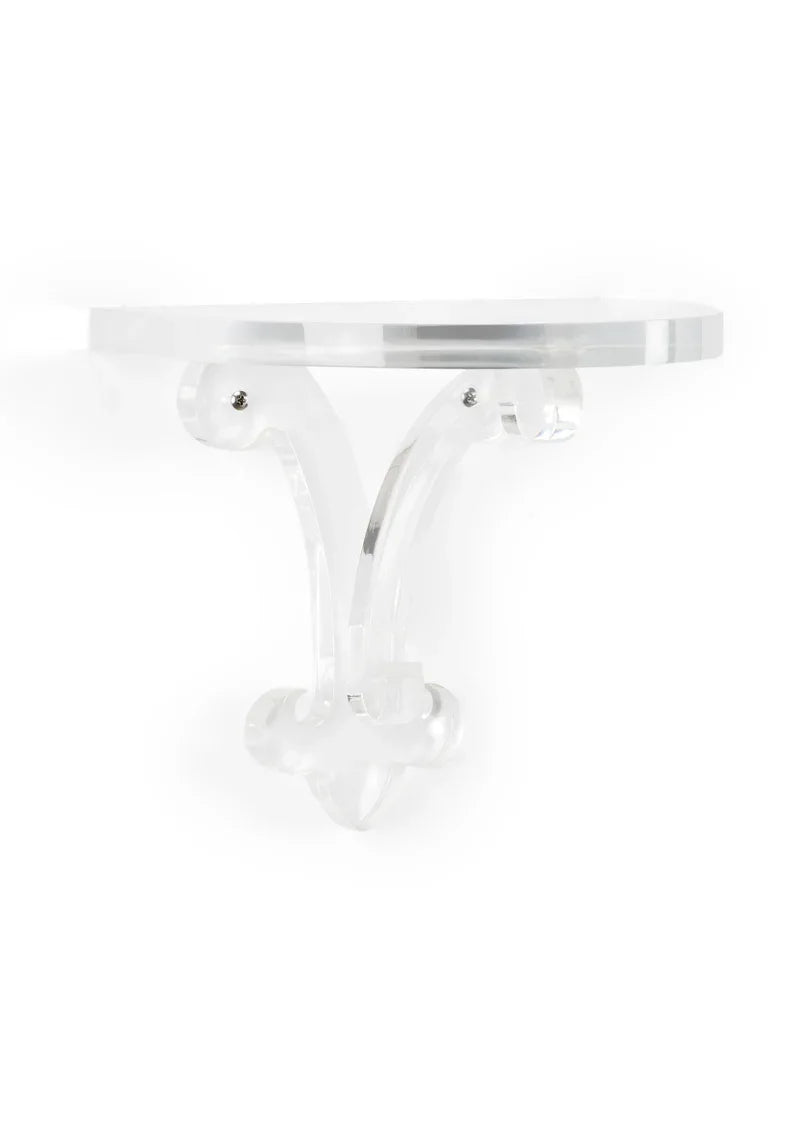 Classical shaped with a rounded shelf and fleur de lis base, Regency is a clear acrylic wall bracket ideal for displaying your favorite accent pieces. Pair the brackets on the side of a mirror or artwork to enhance the look and make it a focal point in your room.