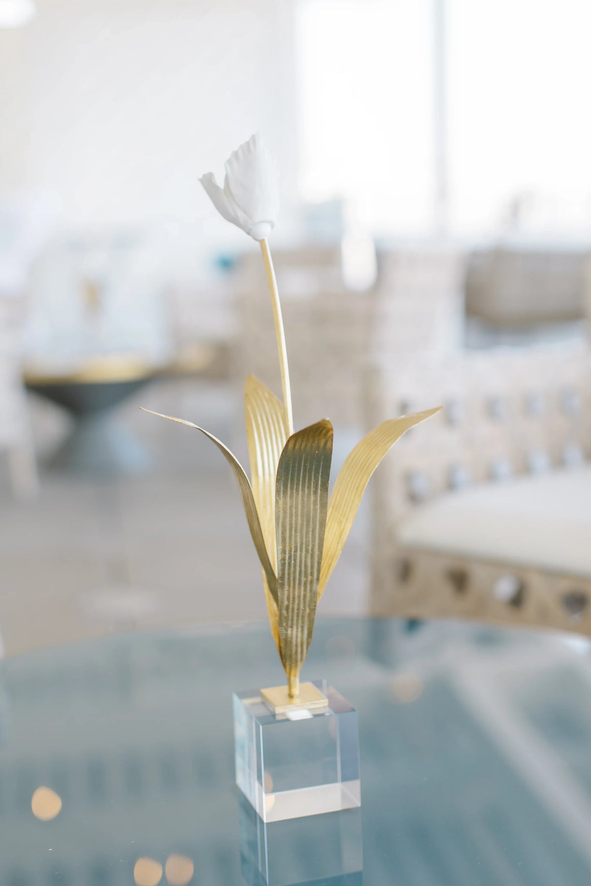 Bring the elegance of nature into your home with this small porcelain tulip. Featuring antique gold leaf on iron, the leaves and stem support a hand crafted, matte white tulip blossom. A square clear crystal stand braces the delicate tulip stem. Beautiful from all sides, this eye-catching accent is ideal for displaying on a cocktail table in a living area or console table in the foyer.