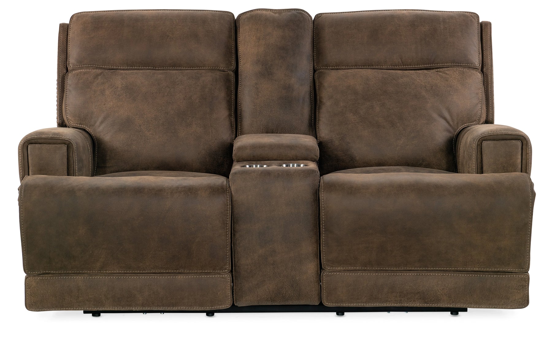 Experience deep relaxation with the Wheeler Zero Gravity Power Loveseat with a power headrest. Featuring a functional center console with a storage area and two cup holders, the plush silhouette has a bustle back with contrasting stitches and gold nailhead trim. The Wheeler is covered in the aniline leather Seville Timber, featuring natural hallmarks of the trail such as fat wrinkles and healed scratches. A wax-based finishing agent creates surface durability and liquid repellency, along with a distinctively smooth hand. A USB port is included for charging electronic devices.