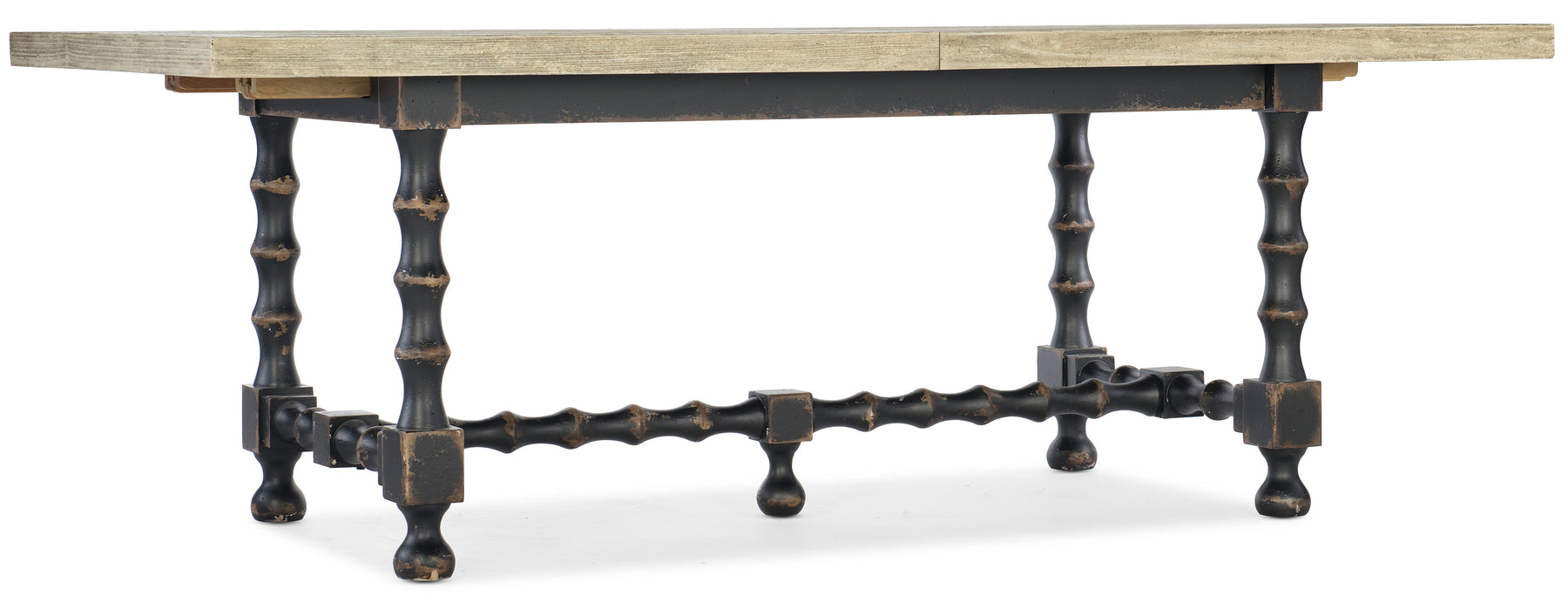 Be transported to a romantic, rustic Italian farmhouse as you dine around the Ciao Bella 84-inch Trestle Table. The base has turned legs and an exquisite black finish with hand-chiseling and wire brushing, and contrasts with a Flaky White top. The two 18-inch leaves extend the table to 120 inches, accommodating up to 10 guests. Beautifully crafted of Poplar Hardwood Solids with Pine Veneers.