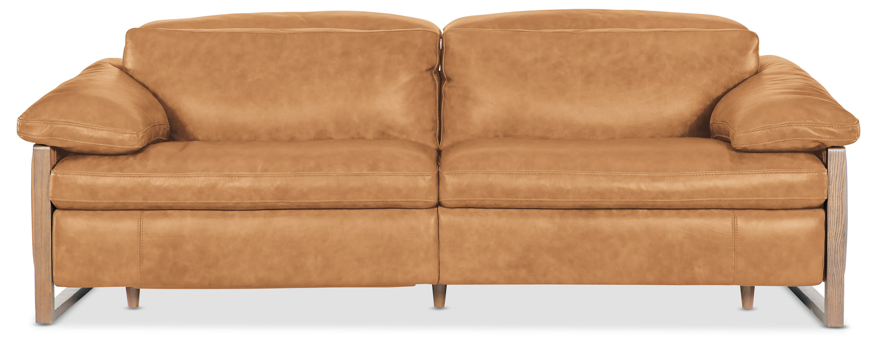 Oversized comfort meets tailored function in the Jericho Power Sofa. Upholstered in Dallas Toffee leather, it features plush pillow arms, wood-framed sides with a sleigh silhouette, and discreetly placed power controls. With a power headrest and USB port, this sofa redefines laid-back luxury.