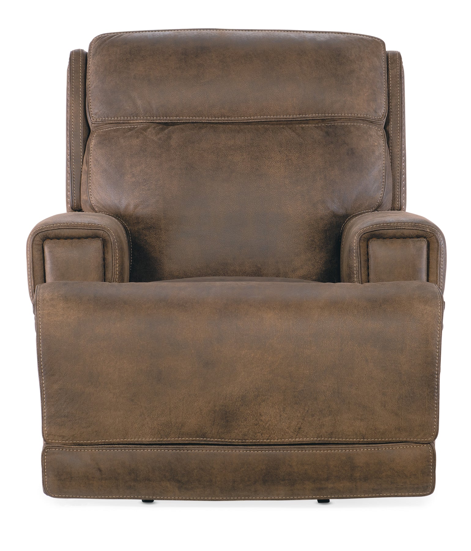 Experience deep relaxation with the Wheeler Zero Gravity Power Recliner with a power headrest. The plush silhouette has a bustle back with contrasting stitches and gold nailhead trim. The Wheeler is covered in the aniline leather Seville Timber, featuring natural hallmarks of the trail such as fat wrinkles and healed scratches. A wax-based finishing agent creates surface durability and liquid repellency, along with a distinctively smooth hand. A USB port is included for charging electronic devices.
