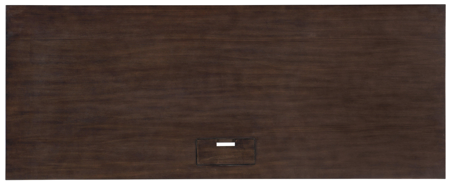 Add stylish work-from-home bandwidth to any space with the House Blend 60in Writing Desk with a sleek combination of the Dark Roast finish over Quartered Ash Veneers and silver metal trim. The bold silhouette is finished on all sides and features a FC705 three-plug electrical outlet in the top for seamless electronics hook ups.