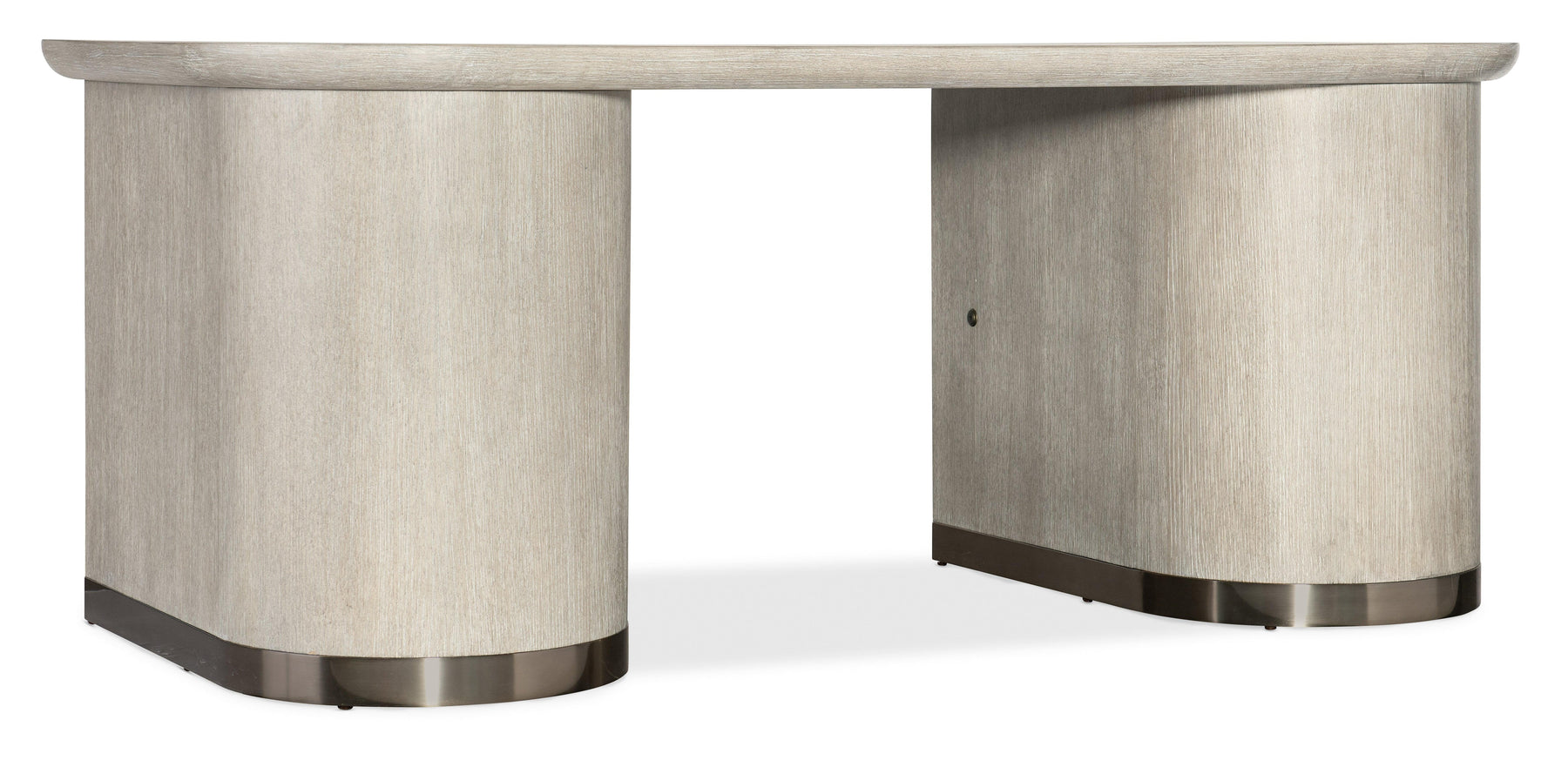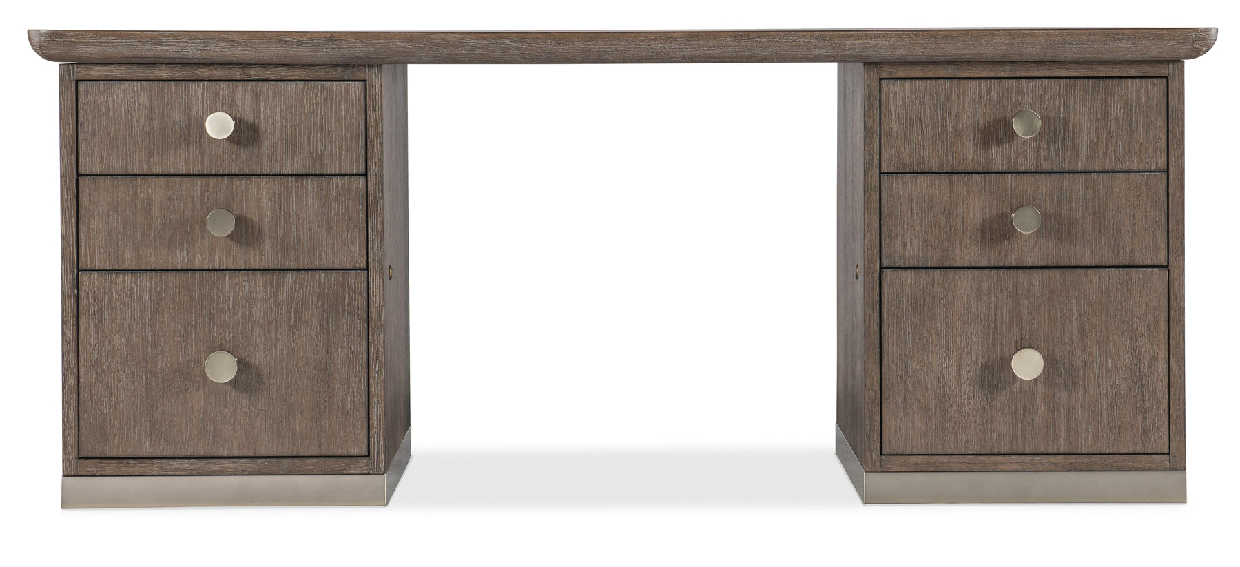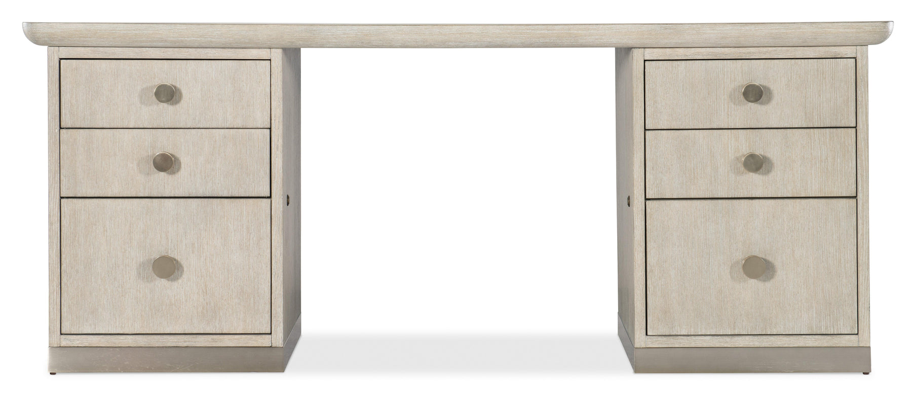 Offered in a clean and unmistakably modern aesthetic that transcends time, the Modern Mood Executive Desk is a statement piece packed with functional features. The Diamond Finish over wire-brushed Quartered Oak Veneers with crystal-like alabaster and pewter hues delivers a soft sophistication, while the metal banding and edging on the base and round metal knobs wrapped in leather offer a mixed-media eclecticism. Features include two locking file drawers with Pendaflex letter/legal filing system, 4 utility drawers, two top left drawers with removable dividers and a top right drawer with removable mouse pad and pencil tray that can be used in either side top drawer. There are locks on the inside of the kneehole area and levelers.