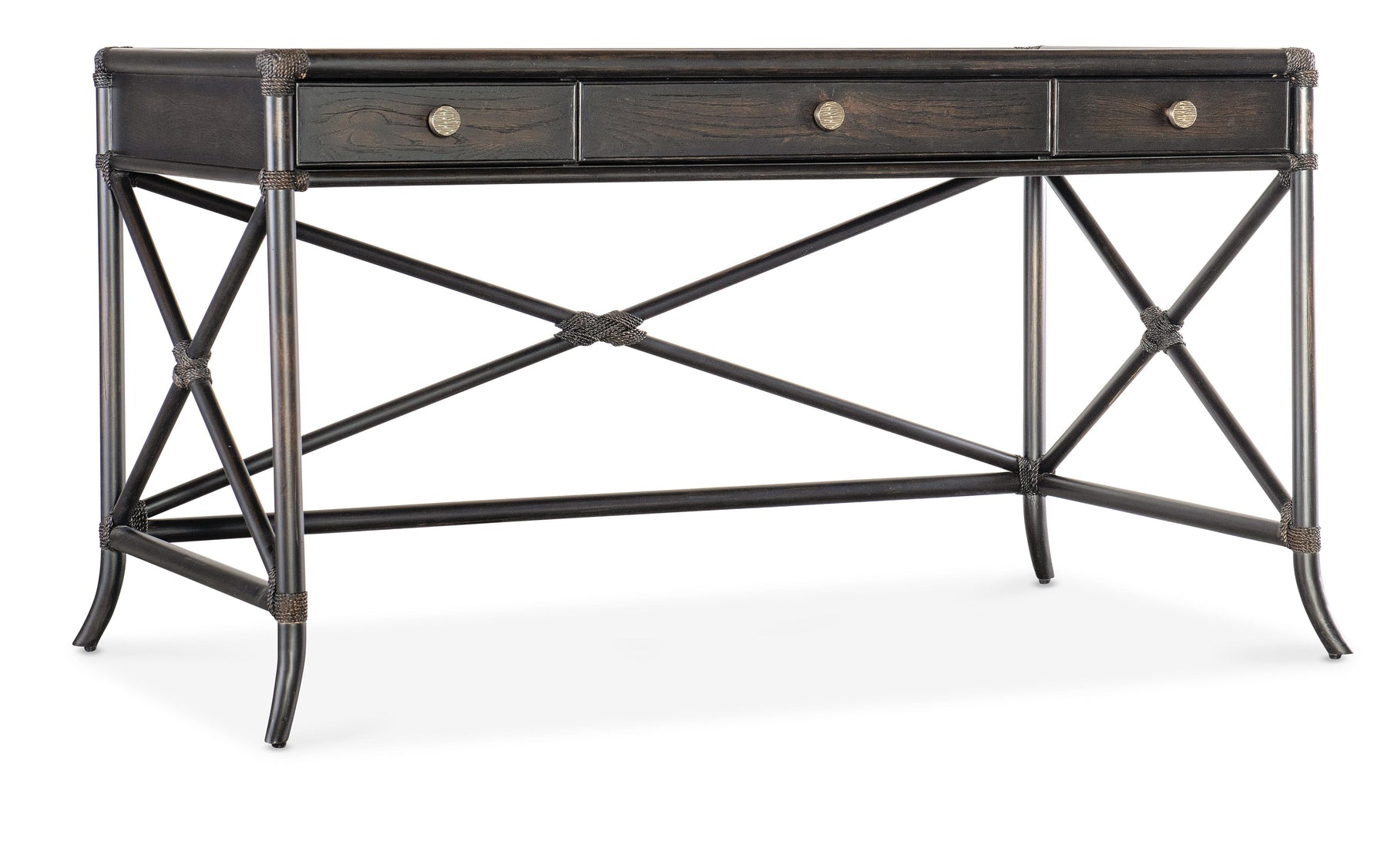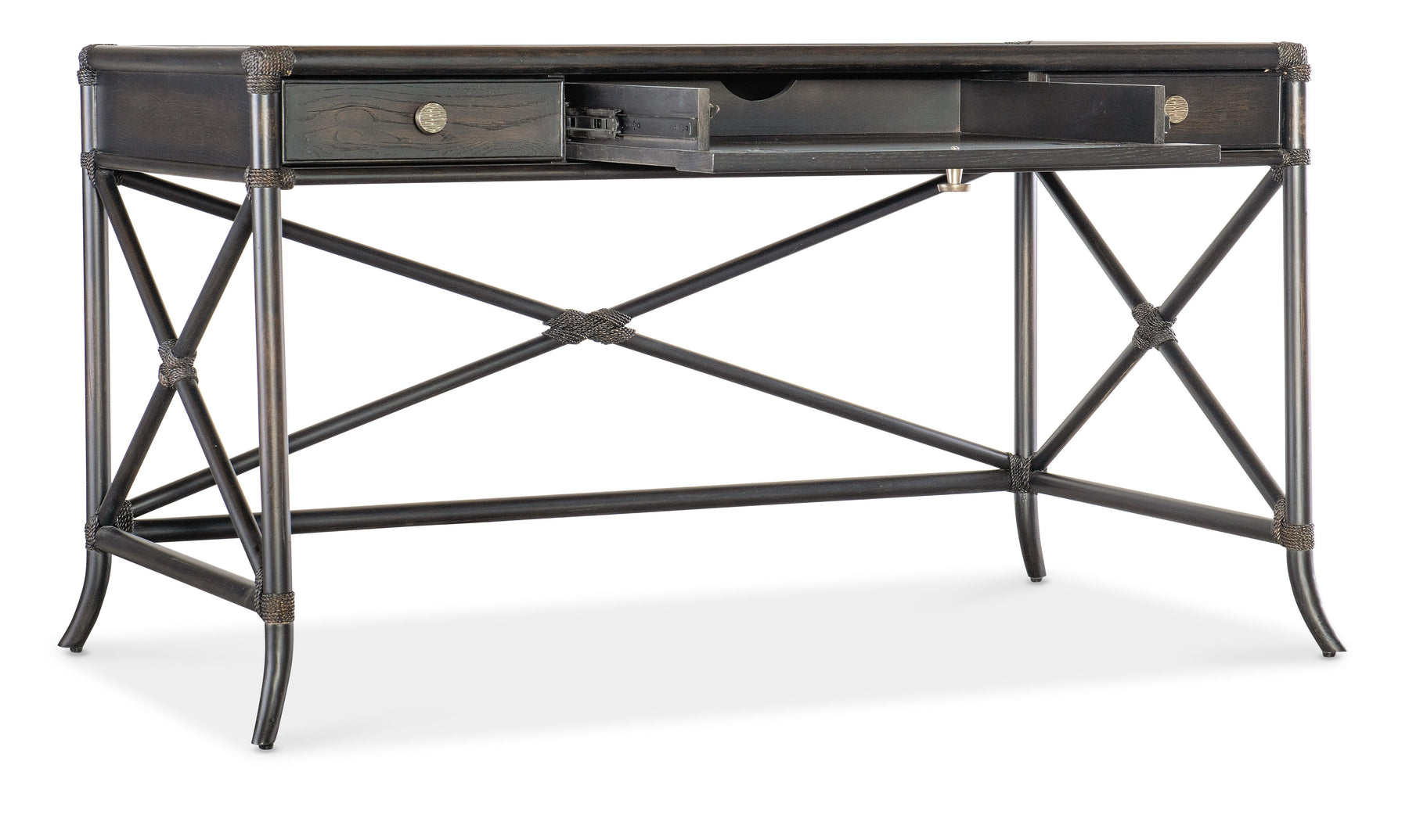With the sublime vibe of an island oasis, the Retreat Writing Desk is crafted of Oak and Maple Veneers in a Bamboo motif and accented by rope. X-design stretchers on the back and sides distinguish the piece, along with the sand-colored Dune finish, transparent by design to showcase the unique patterns of the wood veneer. Featuring three drawers, the left and right drawers have two removable dividers. One pencil tray and one writing slide may be used on either side, and the center drawer has a drop-front for keyboard use. Finished on all sides.