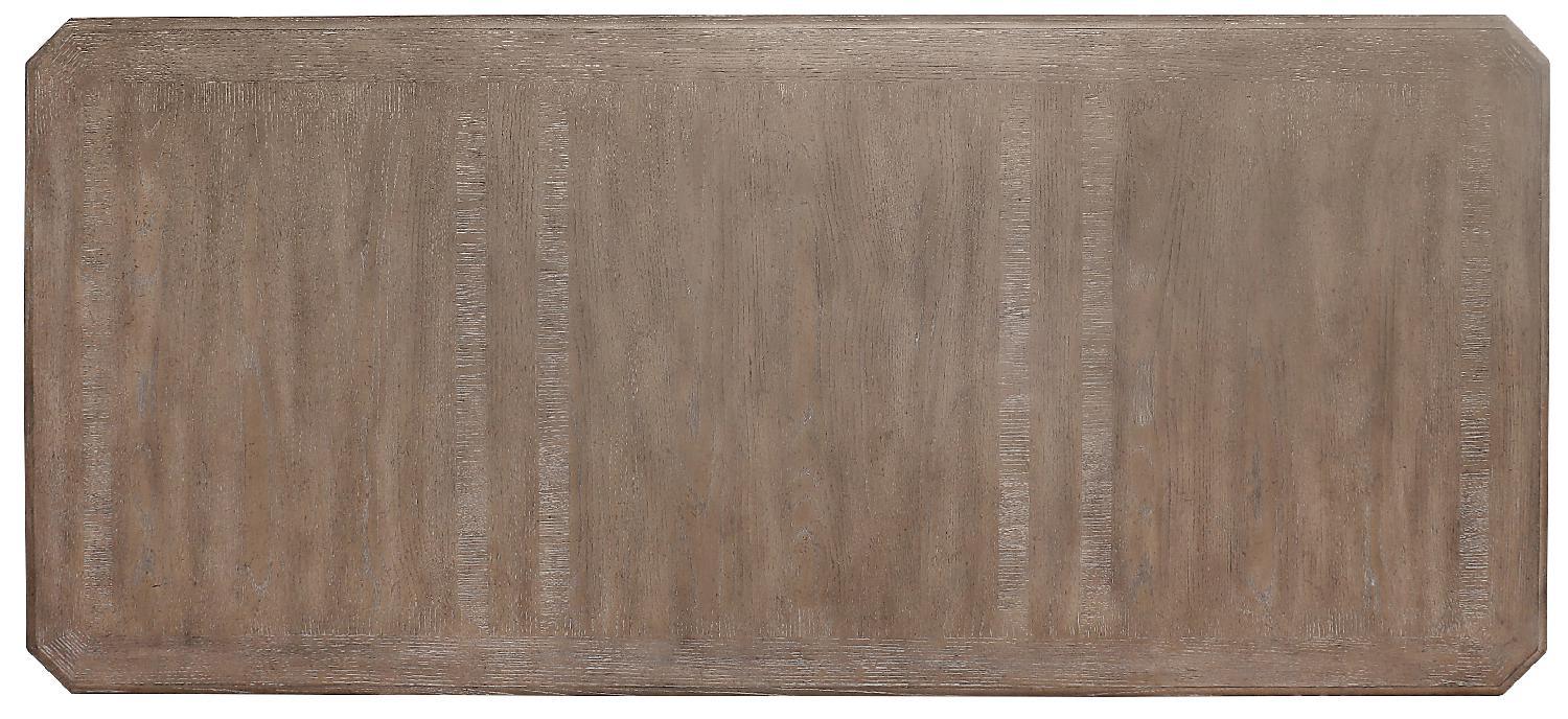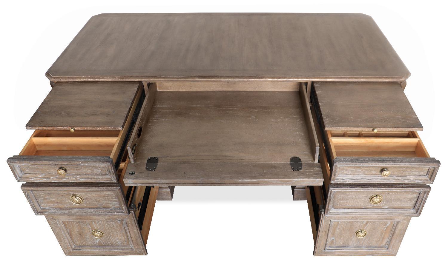 Traditional with a twist, the Sutter Junior Executive Desk is crafted of Cathedral Oak Veneers with a classic silhouette and a casual clear Oak finish with champagne-colored pulls and knobs. Featuring 7 drawers, the top left and right drawers are on full extension metal ball bearing slides with removable divider inserts and one removable pencil drop-in that can be used on either side. Bottom drawers are locking file drawers with pendalfex filing system and full extension metal ball bearing slides. Center drop-front drawer for keyboard use. Two pullout writing slides on left and right. Finished on all sides.