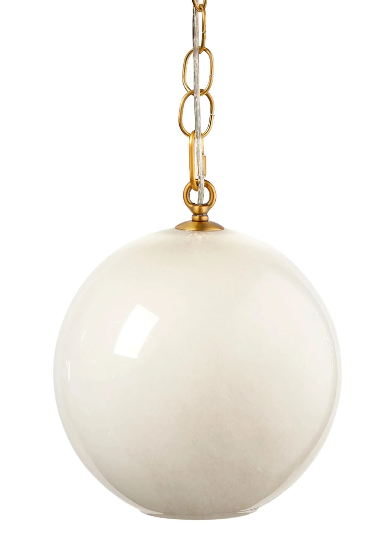 An expertly hand-blown sphere of glass hangs suspended from burnished antique brass links and a coordinating brass canopy in this simply striking pendant lamp. It shines beautifully on its own, illuminating a cozy corner of a den or entryway, or it can create a magnificent display when grouped over a kitchen island or dining table.Assembly Required This camber 1-light blown glass pendant is designed to bring elegance and style to your living space. Explore our collection for dining chairs, outdoor bar stools, bartons cabinets and more. Assembly required.