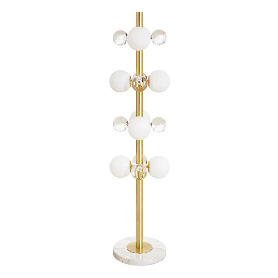 Welcome to our world of dreamy, high-voltage glamour. A symmetrical constellation of clear acrylic and opaque white orbs float on a brushed brass stem anchored by a solid marble base. Our sculptural Globo lighting resuscitates conventional interiors and adds an ultra-glam polish to swanky spaces.
