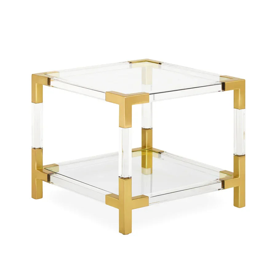 In luxe clear acrylic with brushed brass accents, this petite cube is perfect next to your sofa, by your bed, or saddled up next to your favorite chair. The second shelf offers plenty of space for storing and styling your favorite books and baubles. The perfect blend of simplicity and glamour, modern and traditional. Big presence, weightlessly transparent.