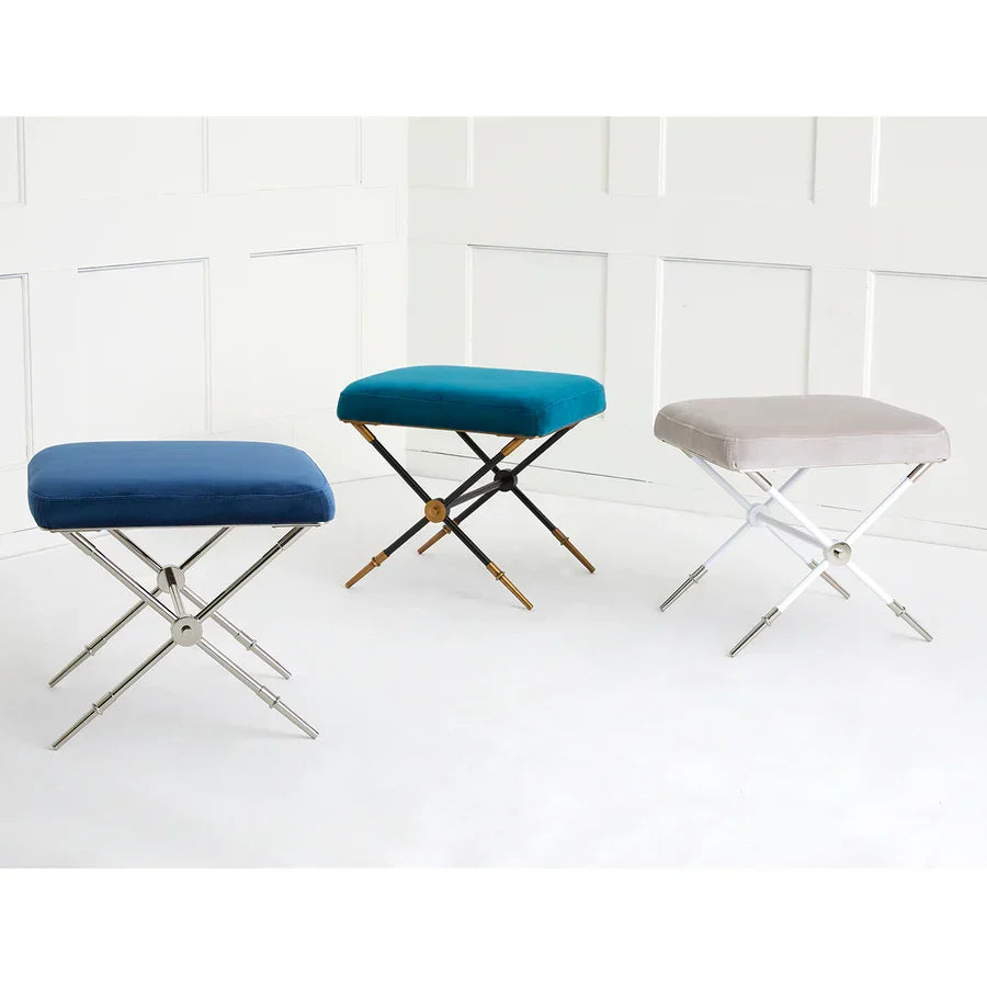 An updated take on Empire style, our Rider X-Bench doubles as a tiny table when topped with one of our trays. The generous seat is covered in velvet atop a sparkling, sabot-detailed nickel frame.