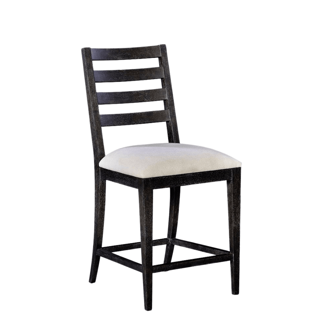 Our Ribbon I Counter Chair features a curved, horizontal ribbed back, tapered legs, a drop-on upholstered seat, and a burnished finish on a metal foot rail
