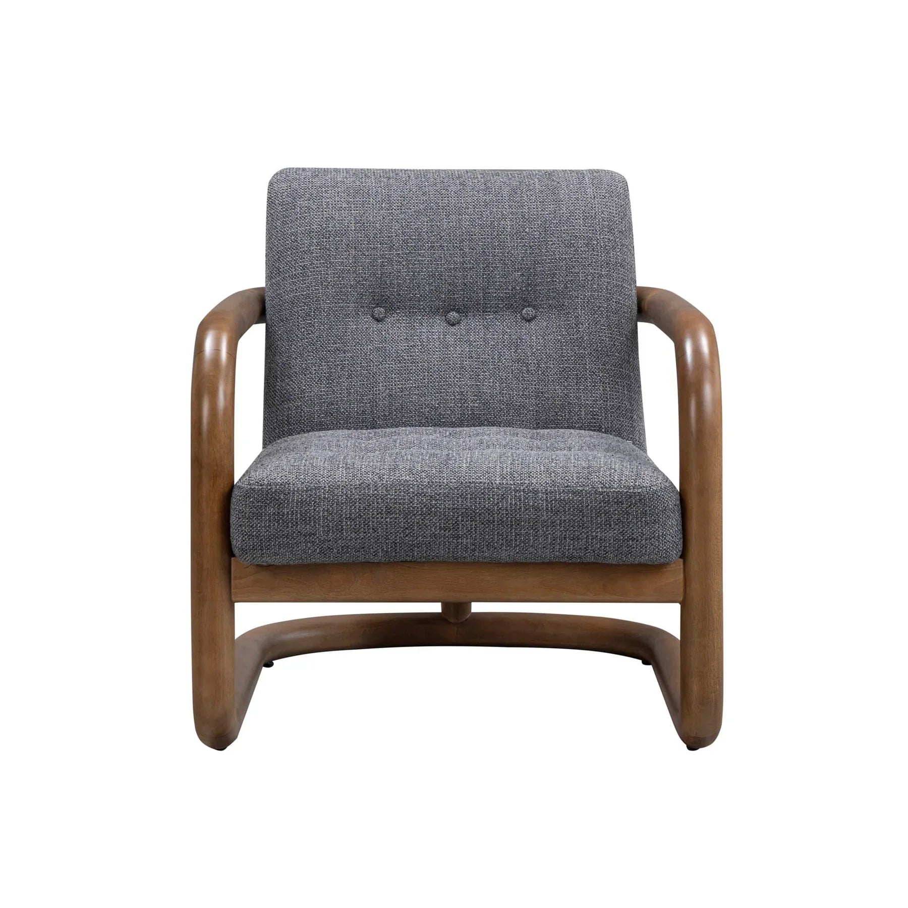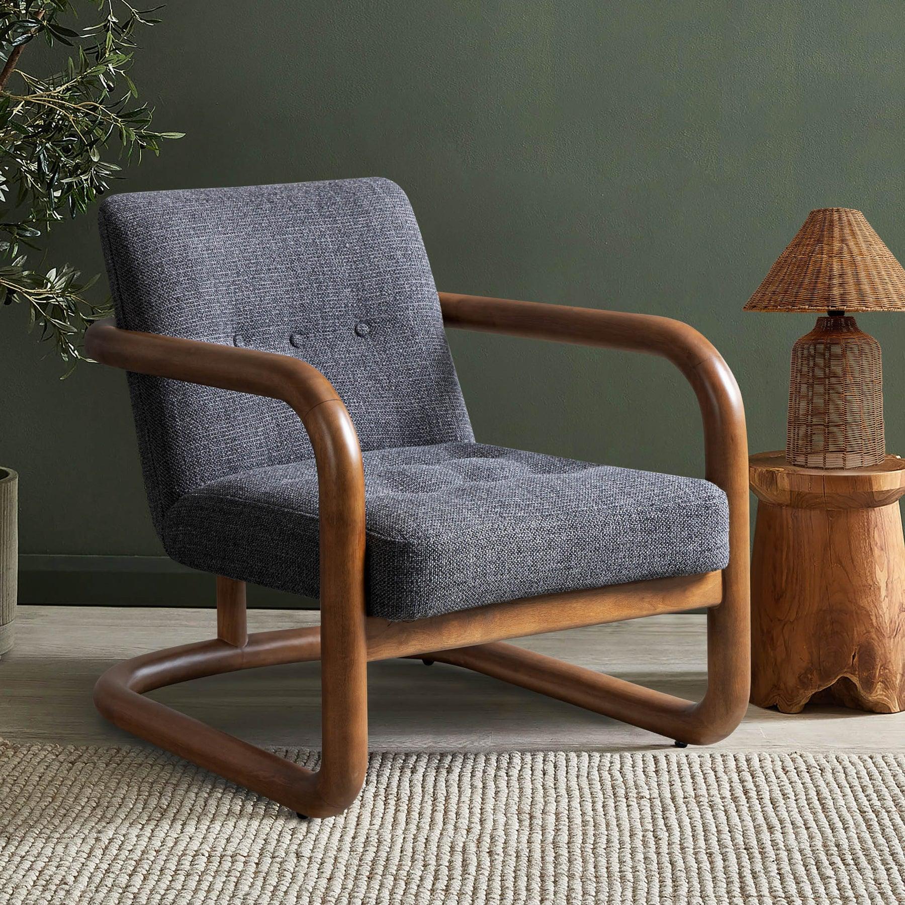 This club chair offers refined comfort with a tufted backrest and exposed rubberwood frame. Available in two fabric options, it is a versatile piece that adapts to any setting while making a stylish statement.