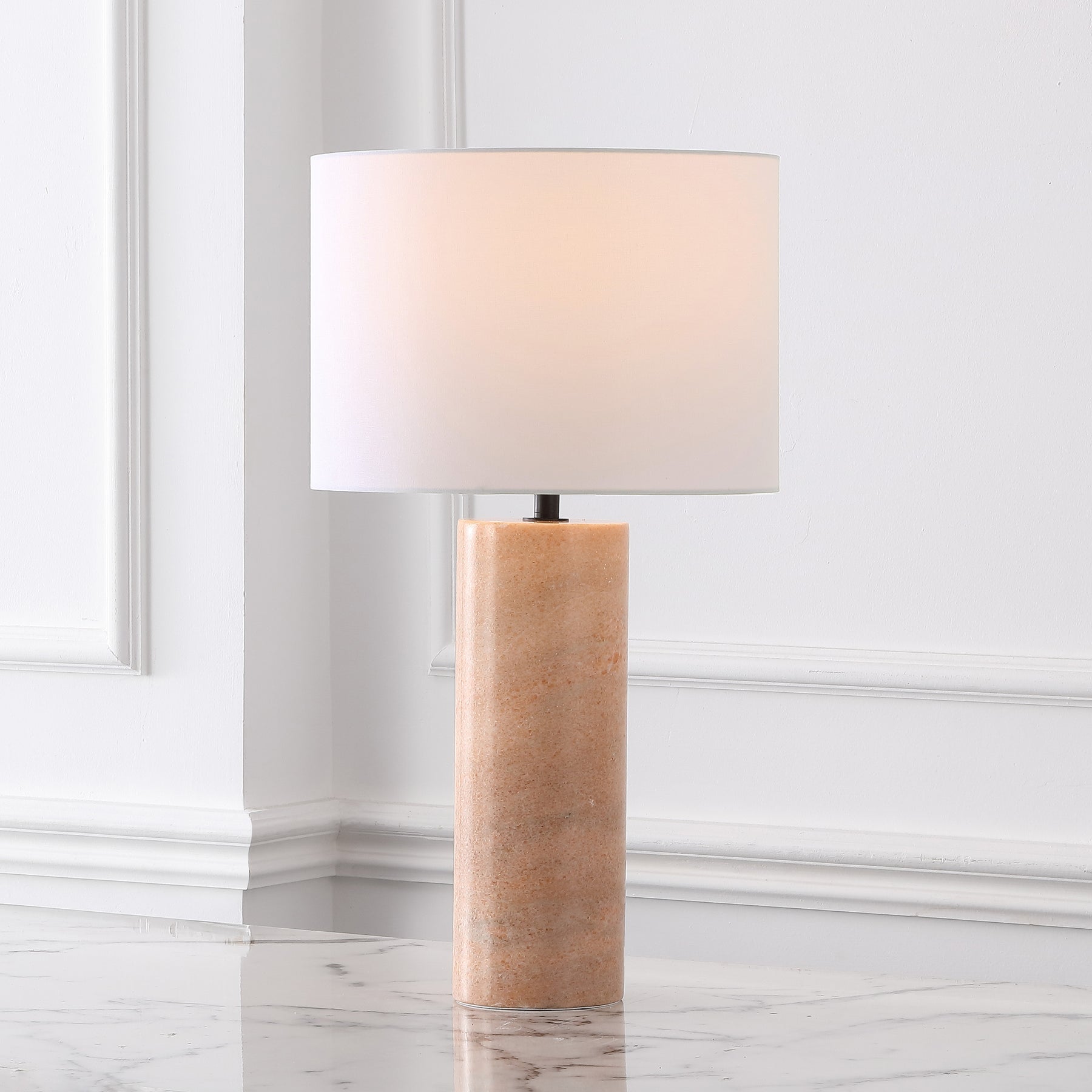 Illuminate your space with the elegant Jillianna round marble table lamp in grey and white. This sophisticated lighting solution is a perfect fusion of modern design and timeless appeal. The lamp features a beautifully crafted marble base, exuding natural charm with subtle grey veining. The sturdy iron components add a sleek touch, enhancing the overall aesthetic.
