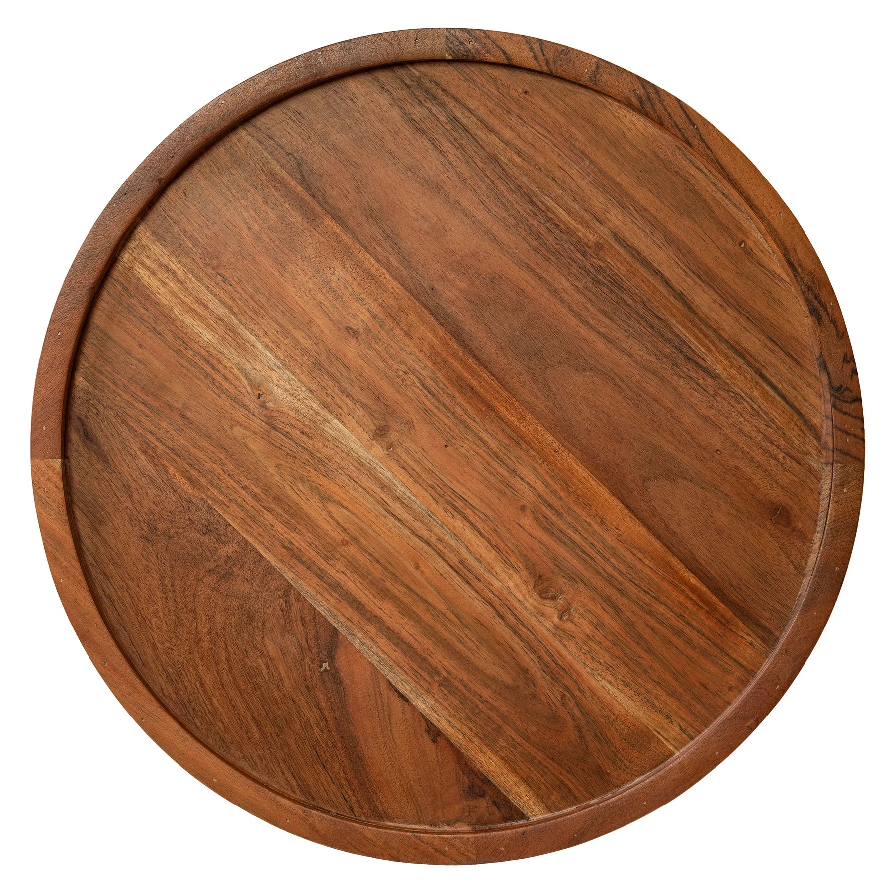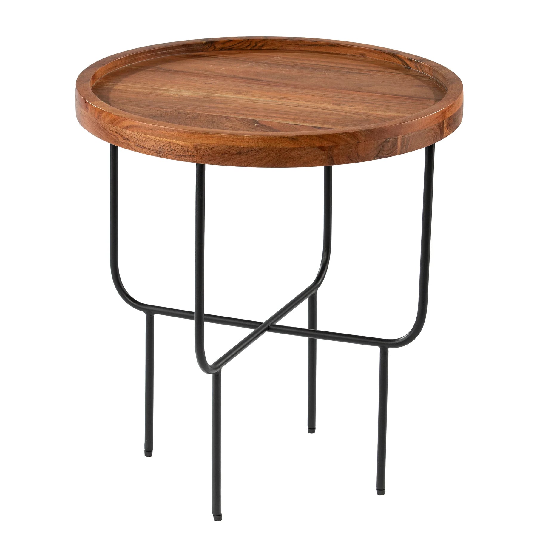 Modernize your farmhouse style with this two-tone end table. A solid wood tabletop offers plenty of room for a lamp and your remote, while the raised, rounded edges create a tray-table look. The unique iron base adds a touch of whimsy, creating a light and airy feel. Your modern farmhouse style gets an elegant upgrade with this round side table in your living space.