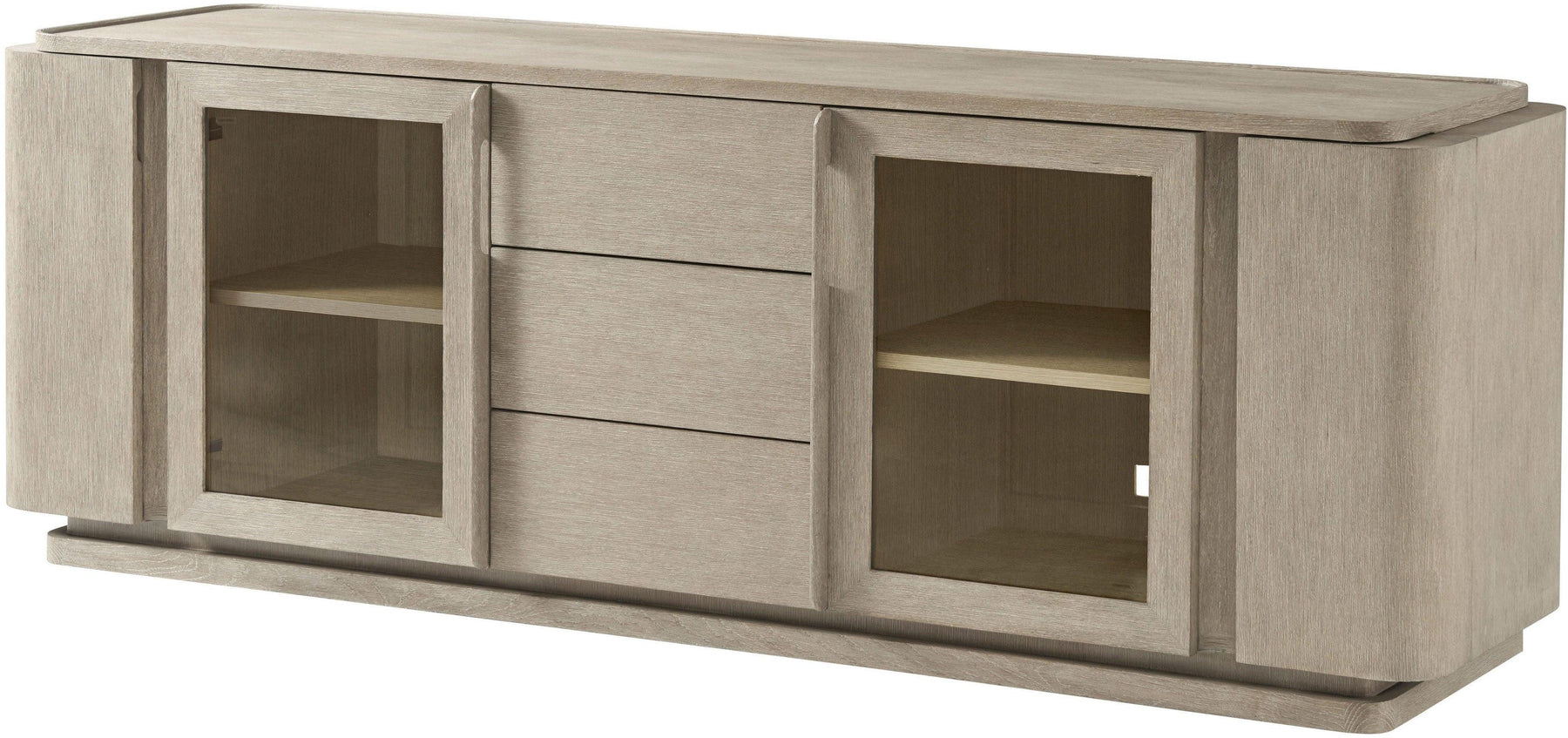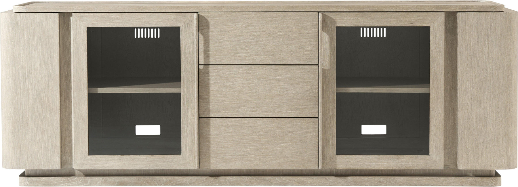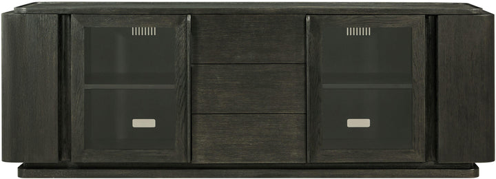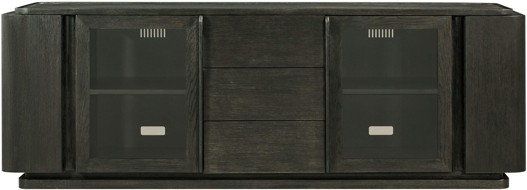 The Repose 80 Glass Door Media Console has an amazing amount of storage for all your media. 2 glass front cabinets with adjustable shelving, cord cutouts and vents at the back. Hidden on the ends are curved doors that conceal 2 small shelves to store away small items, and three, smooth faced, soft close drawers at the front finish the look of this highly functional cabinet which is offered in 2 wood veneer finishes; Gray Oak and Charcoal Oak.