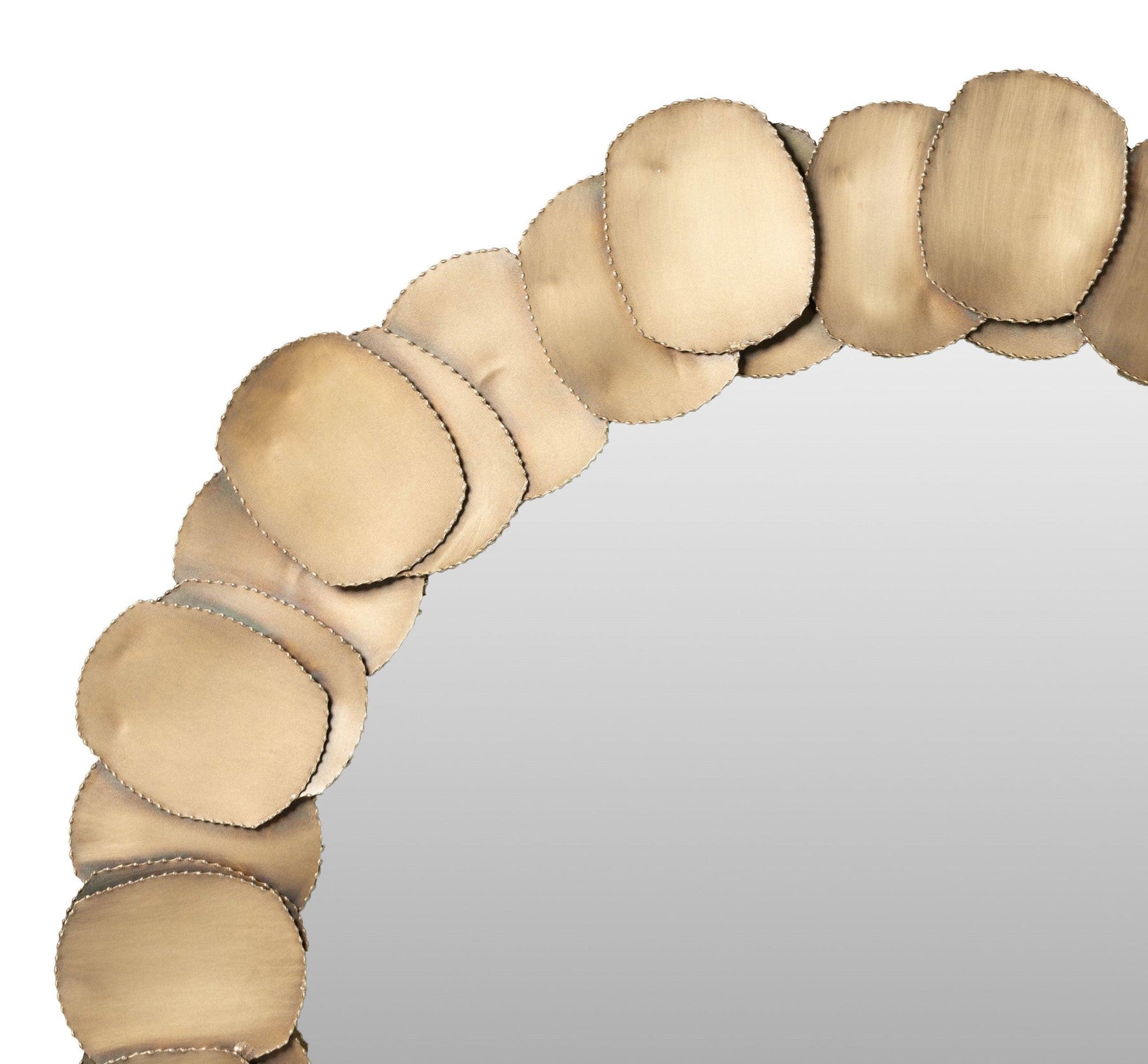The Urbia Suri Mirror features a stunning circular design crafted entirely from iron, showcasing intricate freeform shapes with rippled edges that frame the glass beautifully. This handcrafted decorative iron wall mirror exemplifies exceptional metalwork artistry and meticulous craftsmanship, making it a bold statement piece for any room. Its unique circular frame adds artistic charm and texture, perfect for enhancing modern or industrial-inspired interiors.