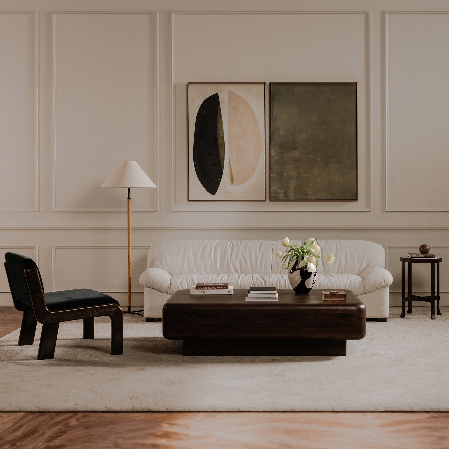 The painting is framed in warm oak-toned wood that complements the olive palette and provides a natural, organic boundary for the composition. The frame's warmth ensures the piece integrates naturally into living rooms, bedrooms, dining rooms, and home offices furnished in natural materials, earthy tones, or organic modern aesthetics. No installation hardware details are required — the framed canvas is ready to hang. An accessible original artwork from a brand that champions natural textures and honest materials.