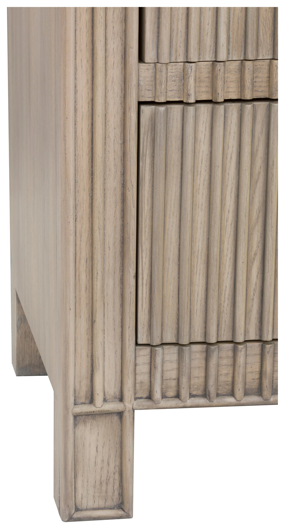 Features Three Drawers In Biscotti Finish With Brushed Brass Hardware.