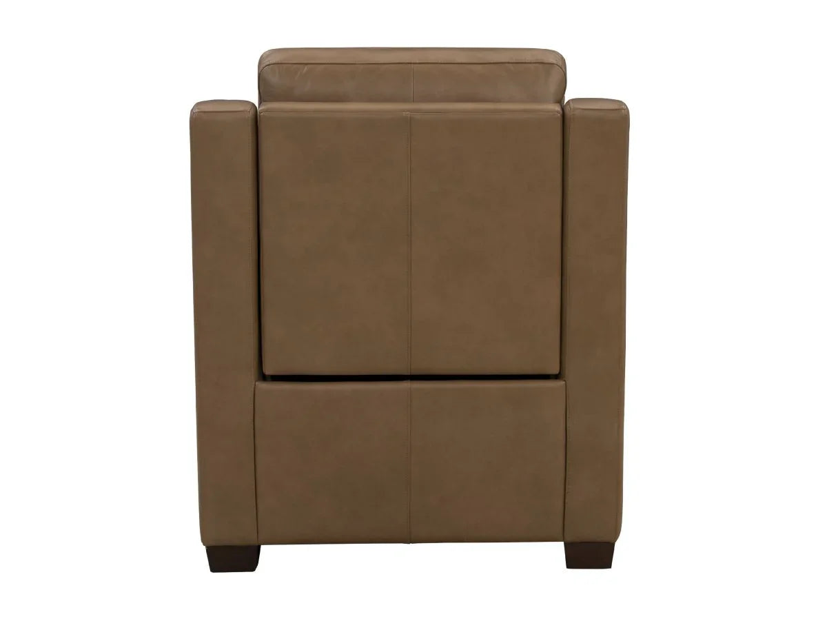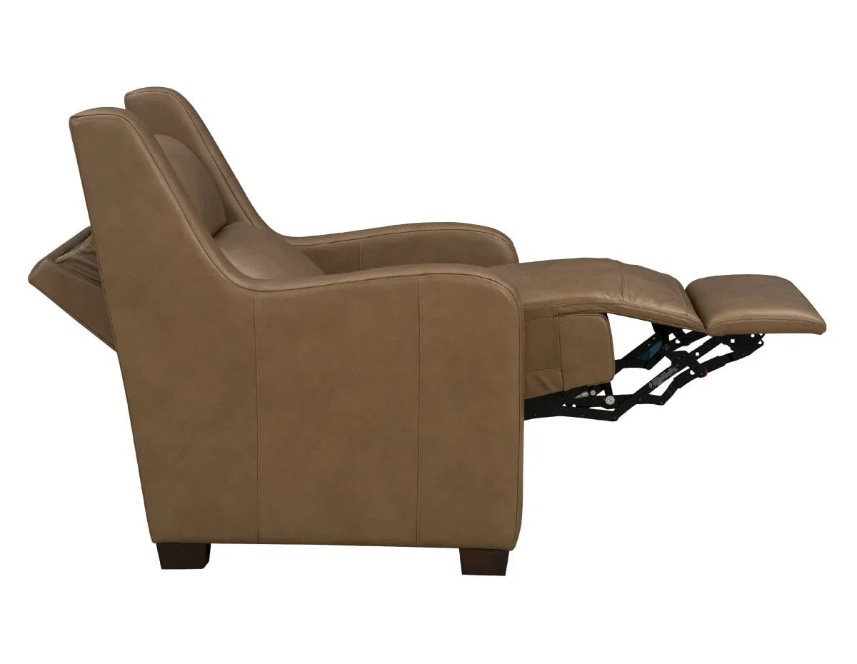 Smaller scale transitional power recliner with banded split pub back, power headrest, power lumbar, and boxed style pad over chaise seating with pocketed coil springs encased in foam and wrapped in Dacron with a down blend topper. Sloped ergonomically shaped track arms and hand carved tapered wood legs. Inside the arm controls with USB ports.