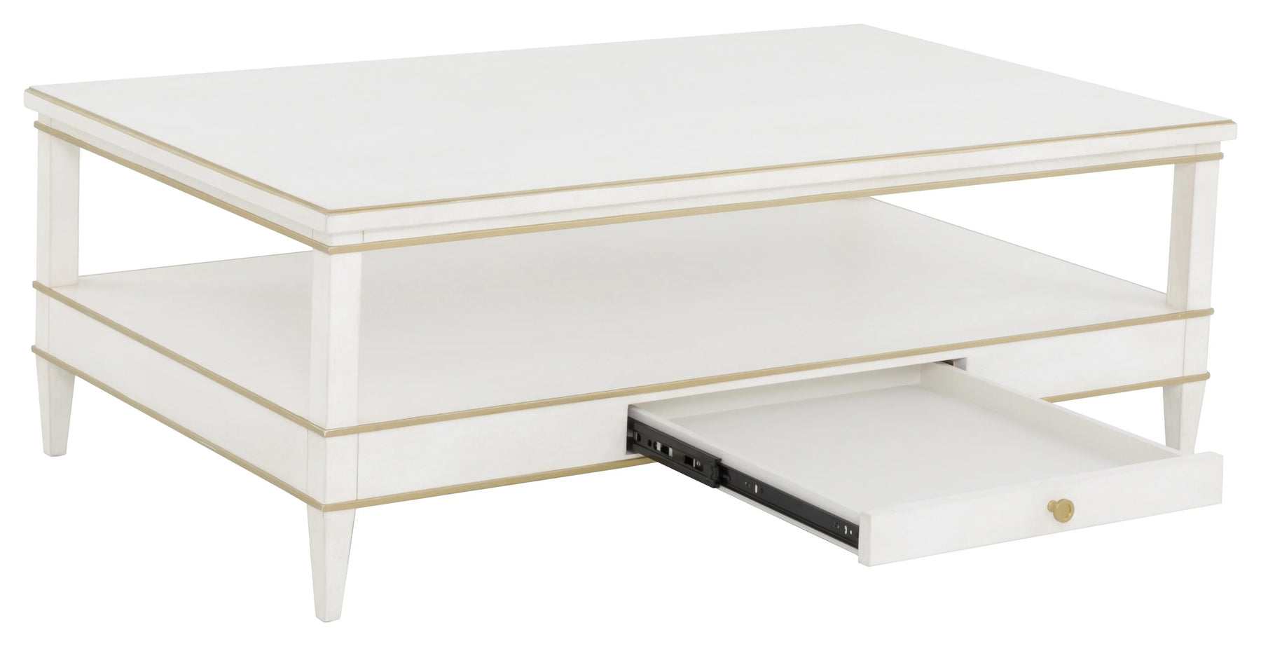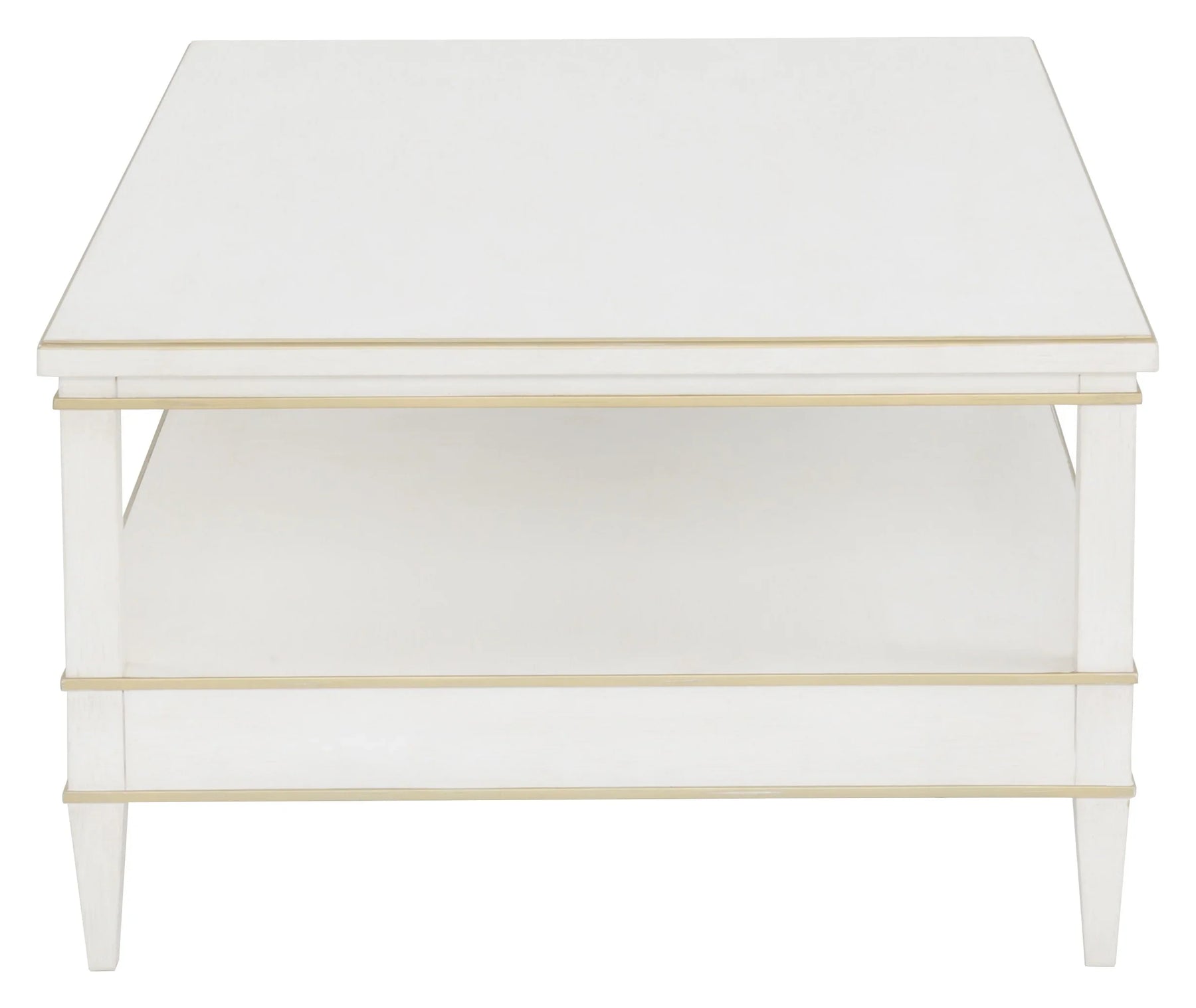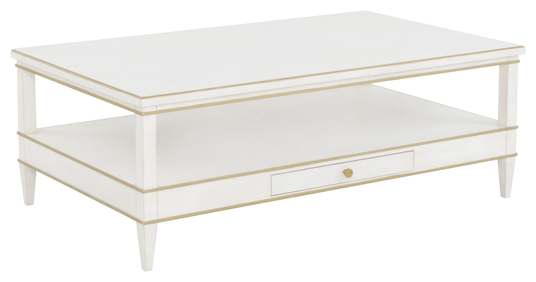 Our Camille Collection merges traditional design elements with a fresh perspective to create a classic and timeless look for today?s modern living. Crafted from rubberwood solids, Camille's classic silhouette is draped in a Linen finish and trimmedin Antique Gold metallic striping. This versatile and storage-friendly collection includes a 24" square and 24" round end tables with pull out shelves and drawer, cocktail table with one drawer, and a console table with one drawer. Camille is stocked Linen or available in 40+ additional custom finishes via our Monogram Program.