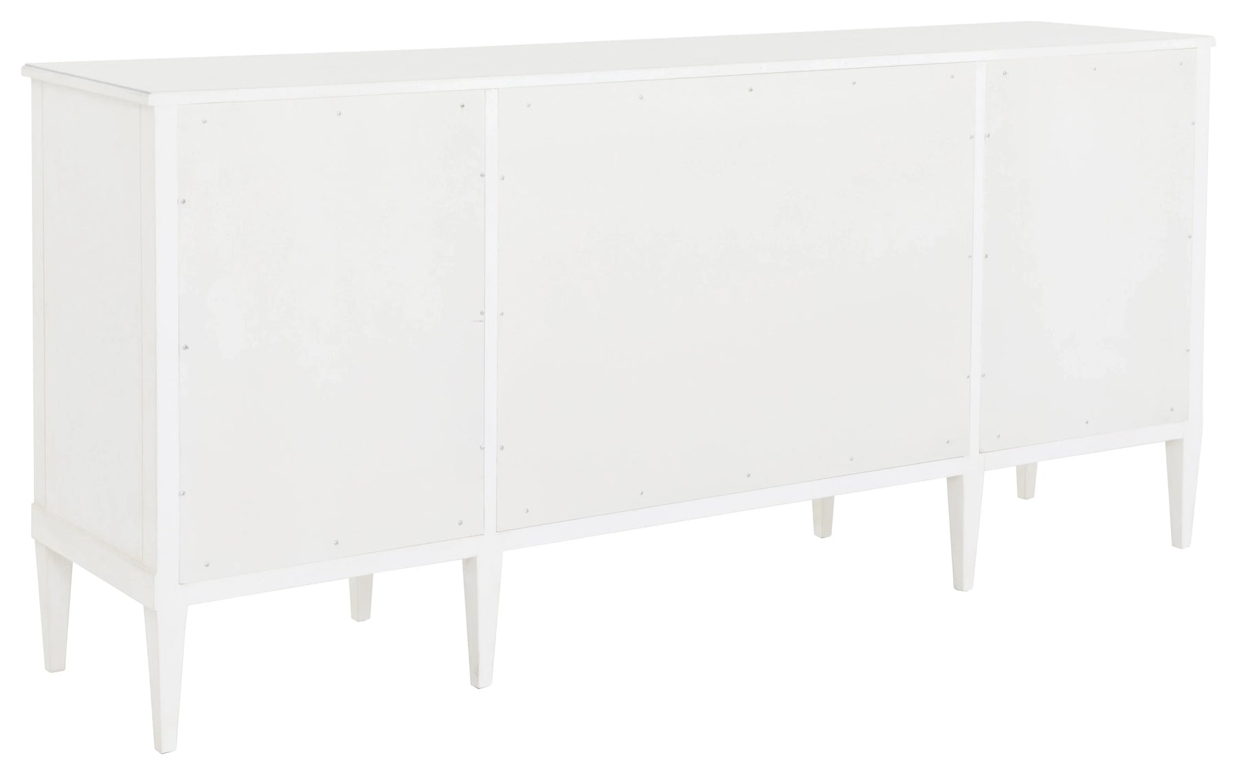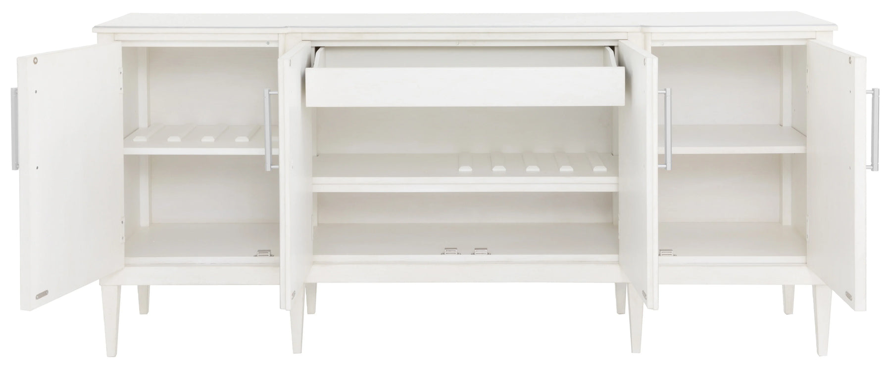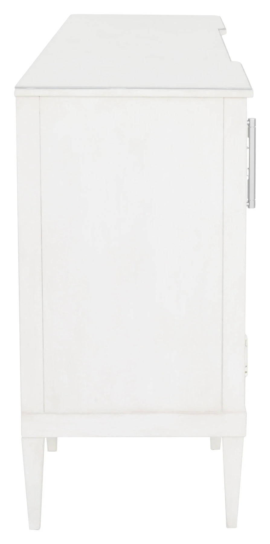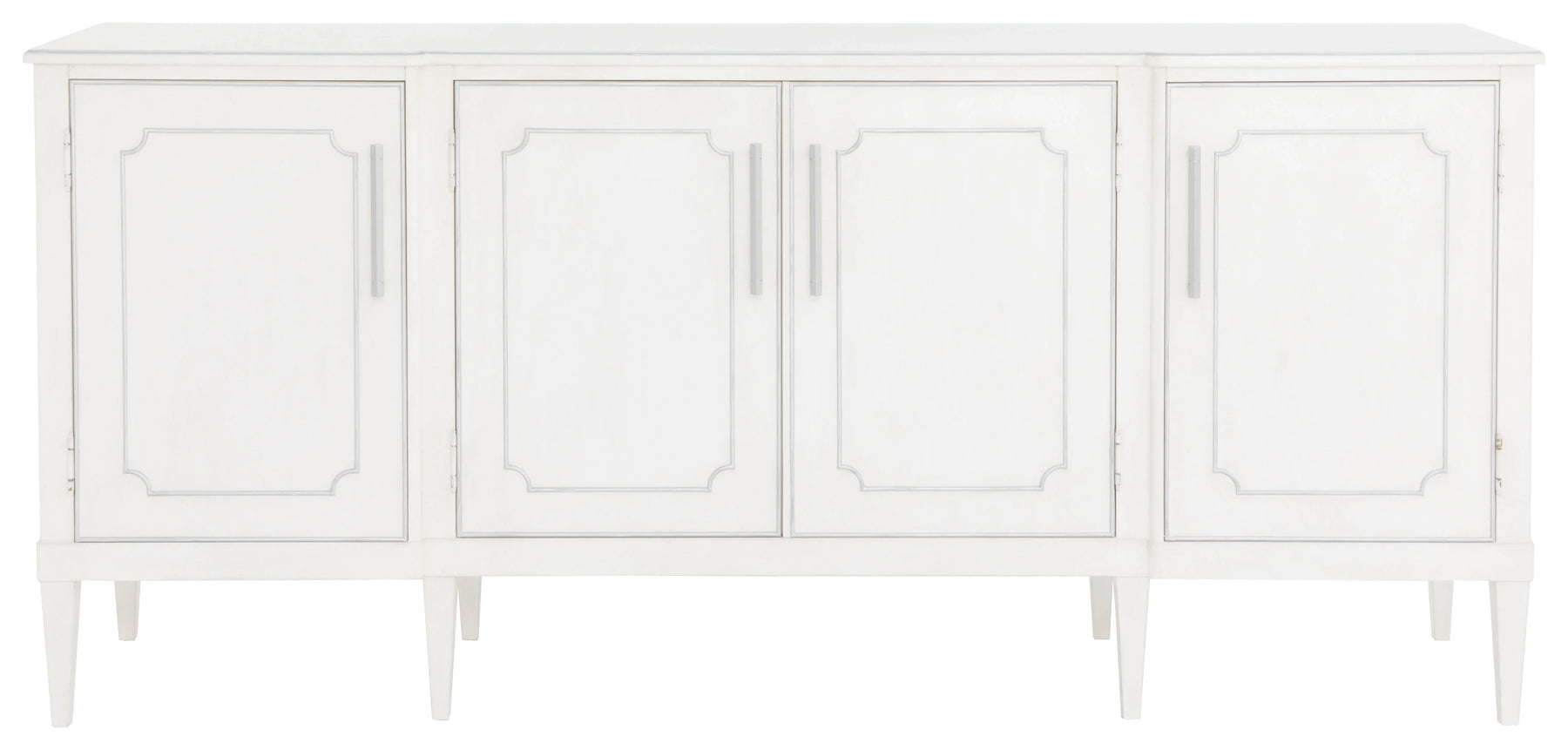 Taking a modern approach to traditional design elements, our Camille Dining Collection includes a dining table, credenza and bar cabinet. Crafted from rubberwood solids and finished in Linen with a contrast highlight stripe in Antique Pewter. Camille features many guest and storage-friendly solutions, including: a dining table extends from 77" to 121" wide, a marble-topped bar cabinet with one interior drawer and reversible shelf with wine storage, and a credenza with four drawers, one center drawer and adjustable shelves. Camille is stocked Linen or available in 40+ additional custom finishes via our Monogram Program.