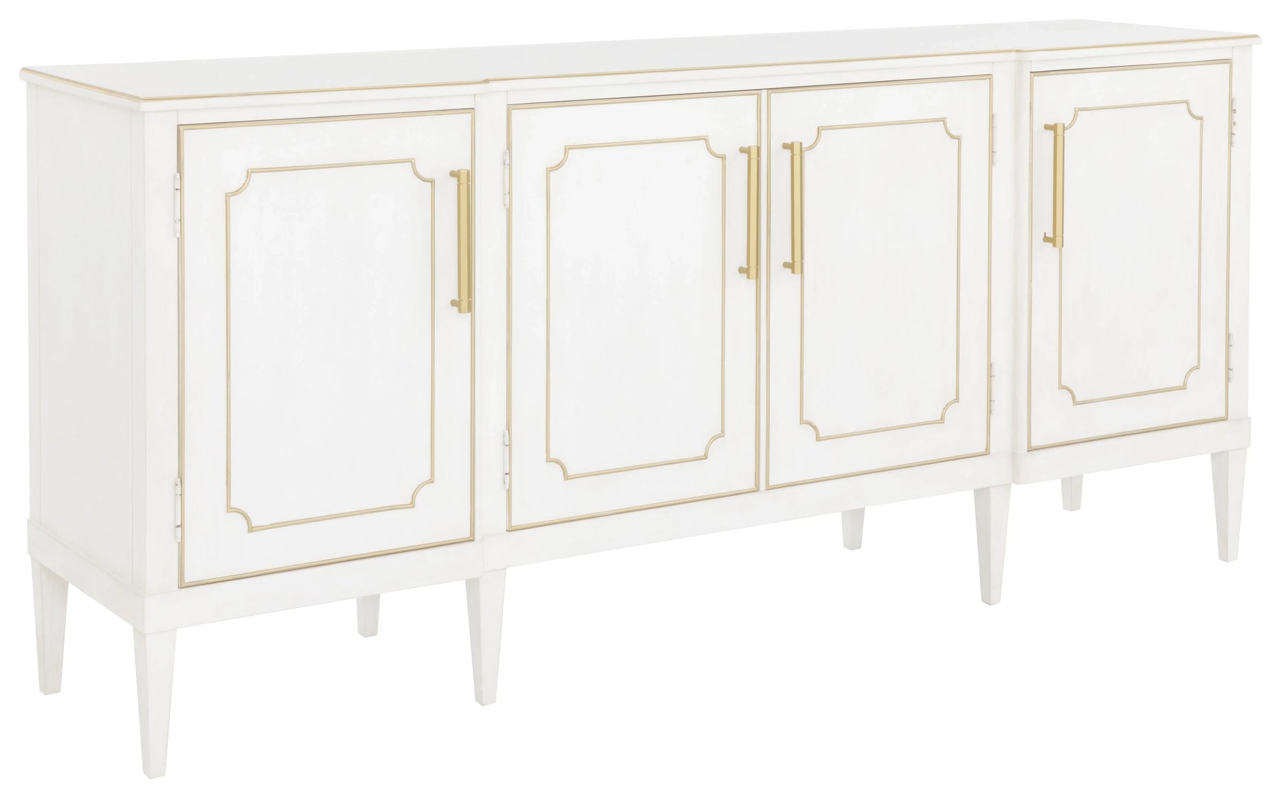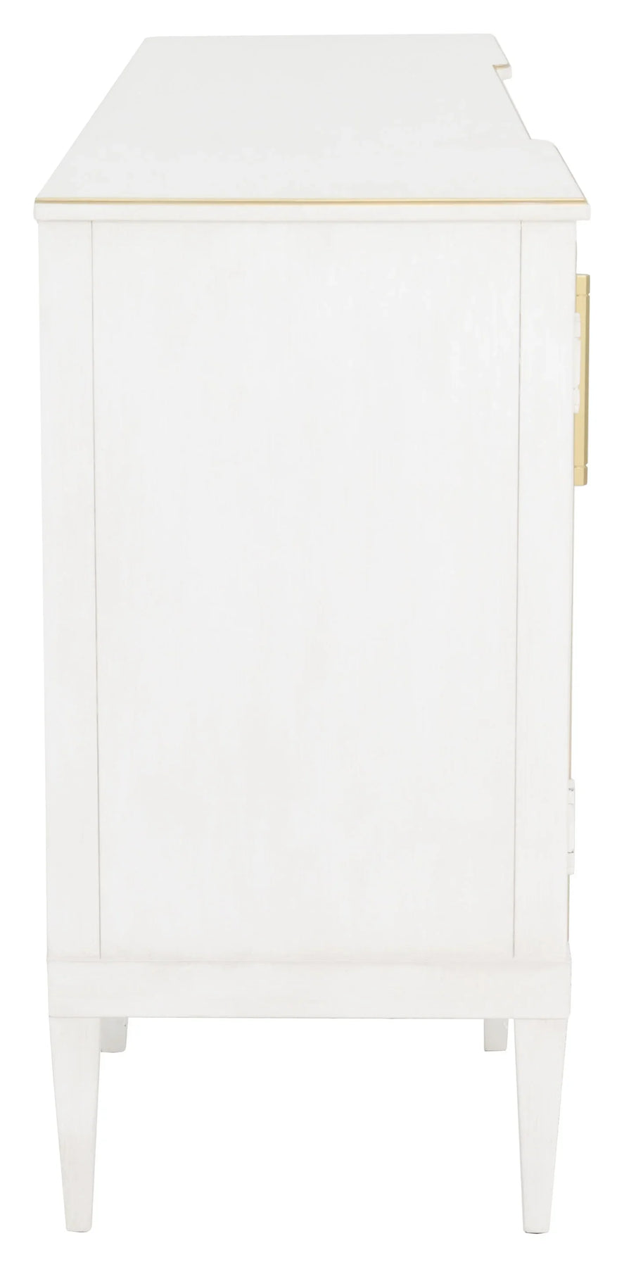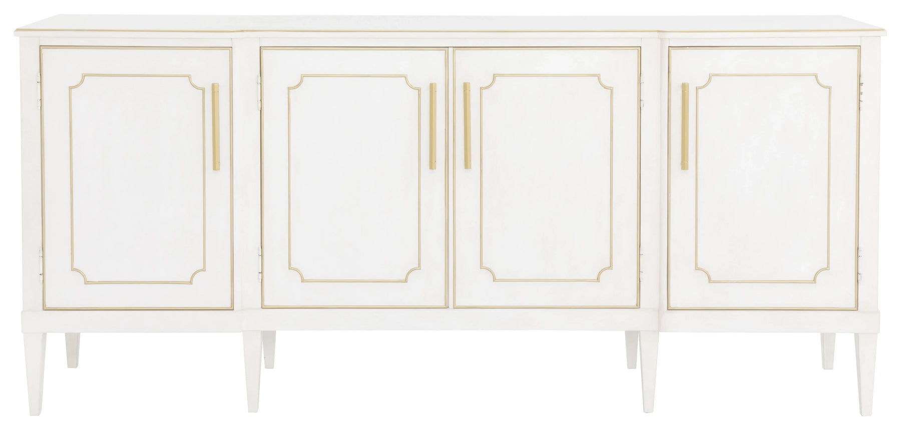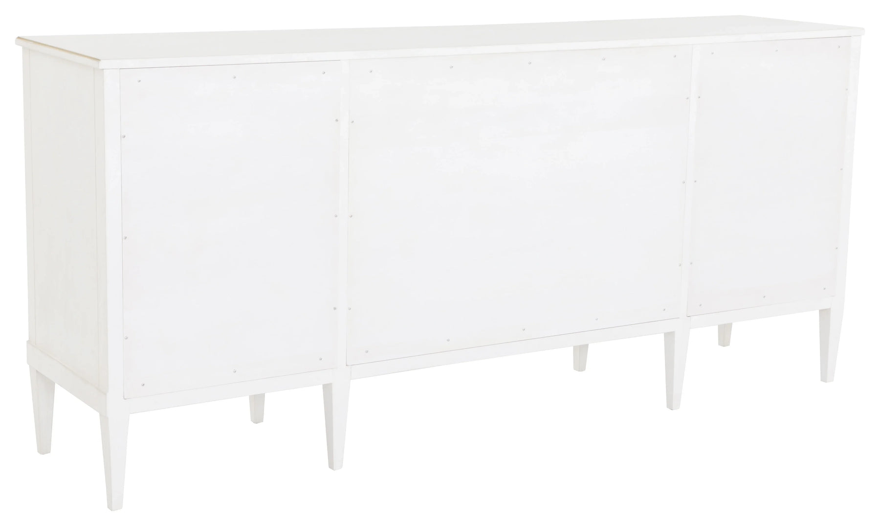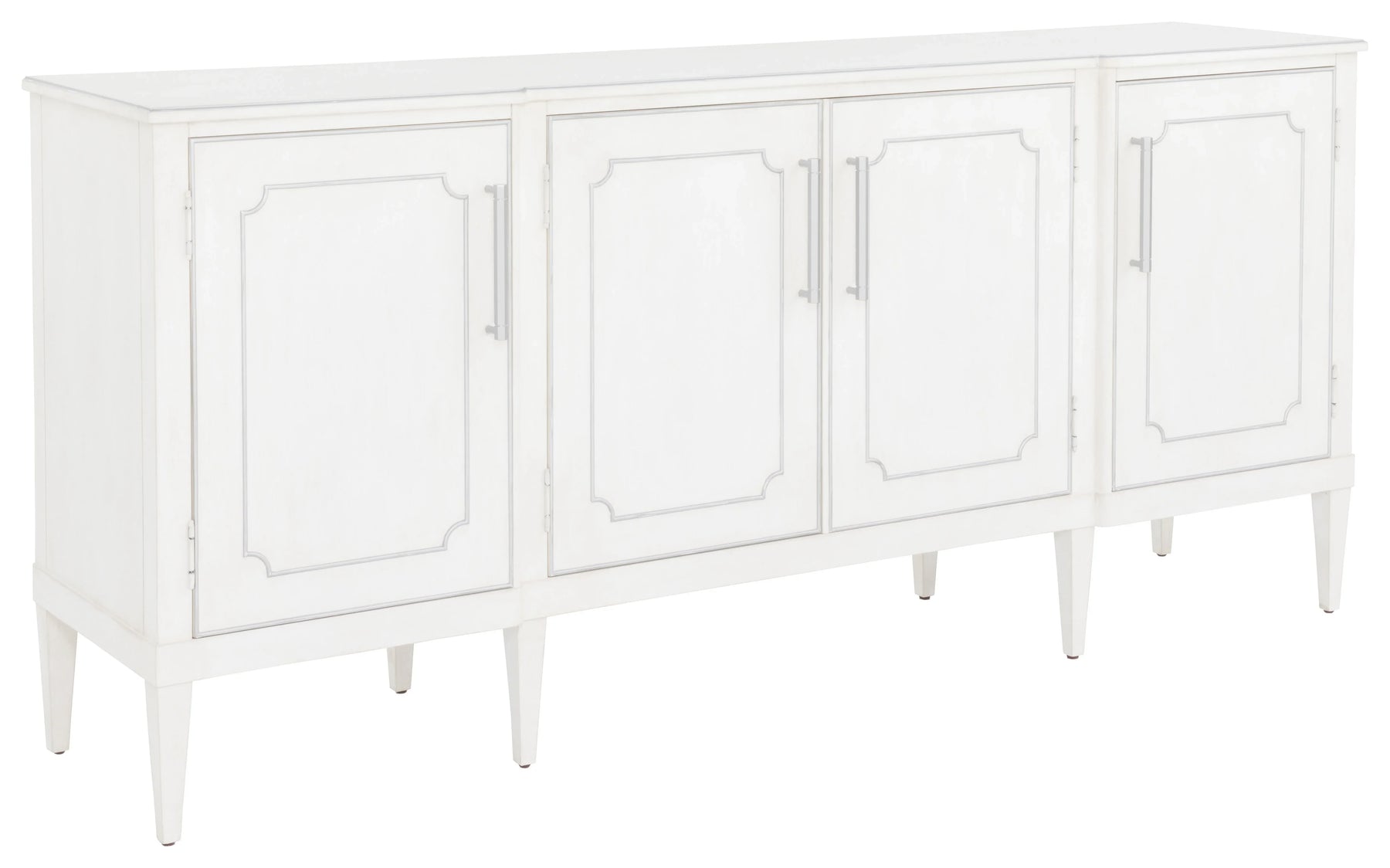 Taking a modern approach to traditional design elements, our Camille Dining Collection includes a dining table, credenza and bar cabinet. Crafted from rubberwood solids and finished in Linen with a contrast highlight stripe in Antique Pewter. Camille features many guest and storage-friendly solutions, including: a dining table extends from 77" to 121" wide, a marble-topped bar cabinet with one interior drawer and reversible shelf with wine storage, and a credenza with four drawers, one center drawer and adjustable shelves. Camille is stocked Linen or available in 40+ additional custom finishes via our Monogram Program.