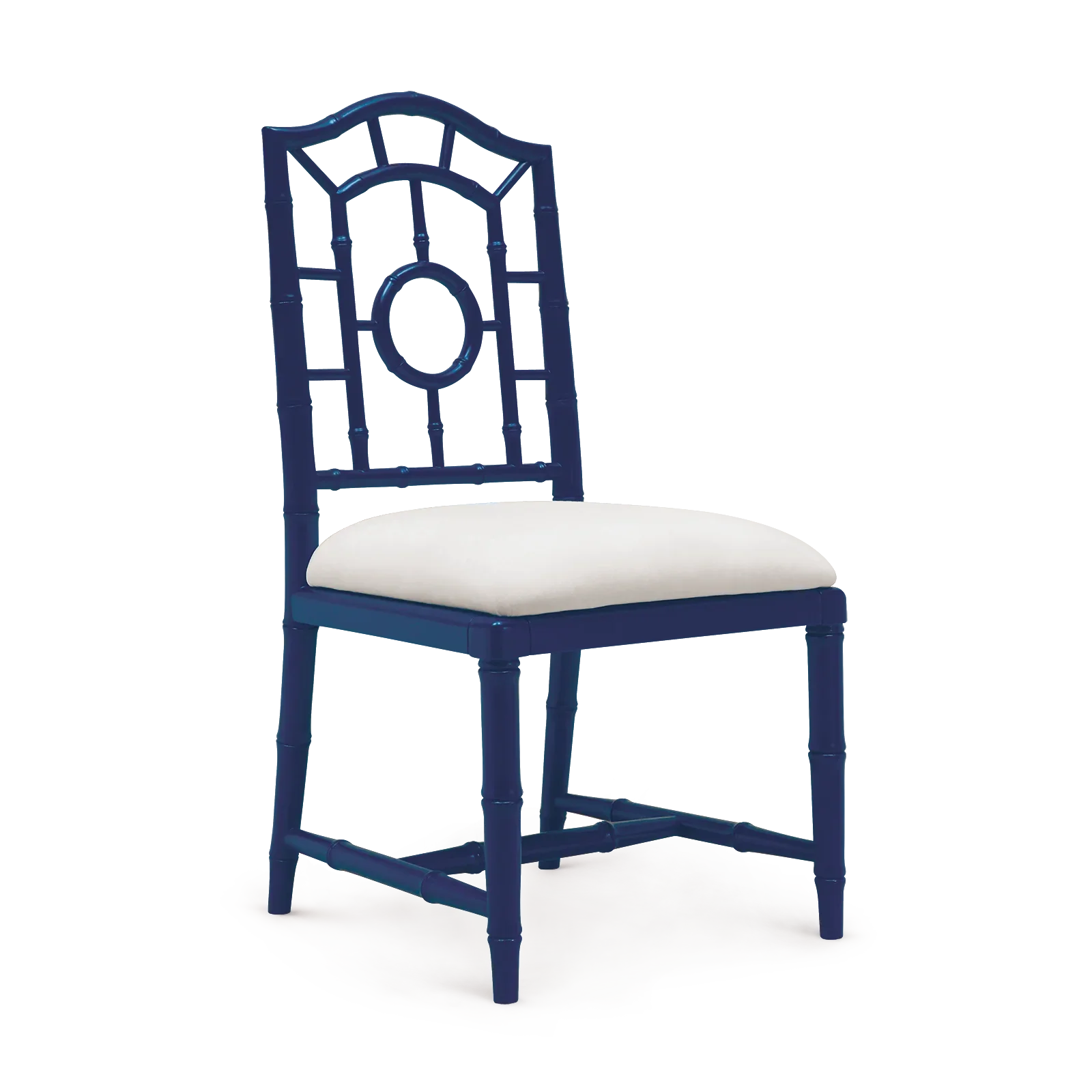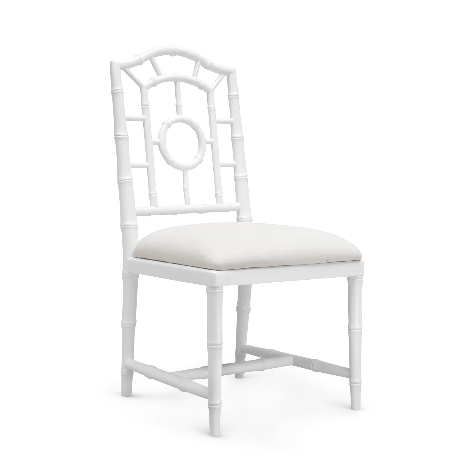 Throughout the Chloe Collection, our craftsmen have taken the ornate elements of Chinoiserie design, made famous by the likes of Thomas Chippendale in the 18th century, and pared them down to showcase their elegant essence through refined simplicity. Solid mahogany has been expertly carved to resemble bamboo, lacquered and finished in clean white, which here makes up the fretwork of the Chloe Side Chair, forming an airy, Asian-inspired patterned back. With a lightness fit for a sunny beach home (or a bedroom, living room or study you wish would feel like one), the faux bamboo continues down through the legs and decorative stretcher, all pulled together by a comfortable linen drop-in cushion seat. As a set in a kitchen or dining room, these chairs provide upscale luxury with a touch of Pacific paradise.