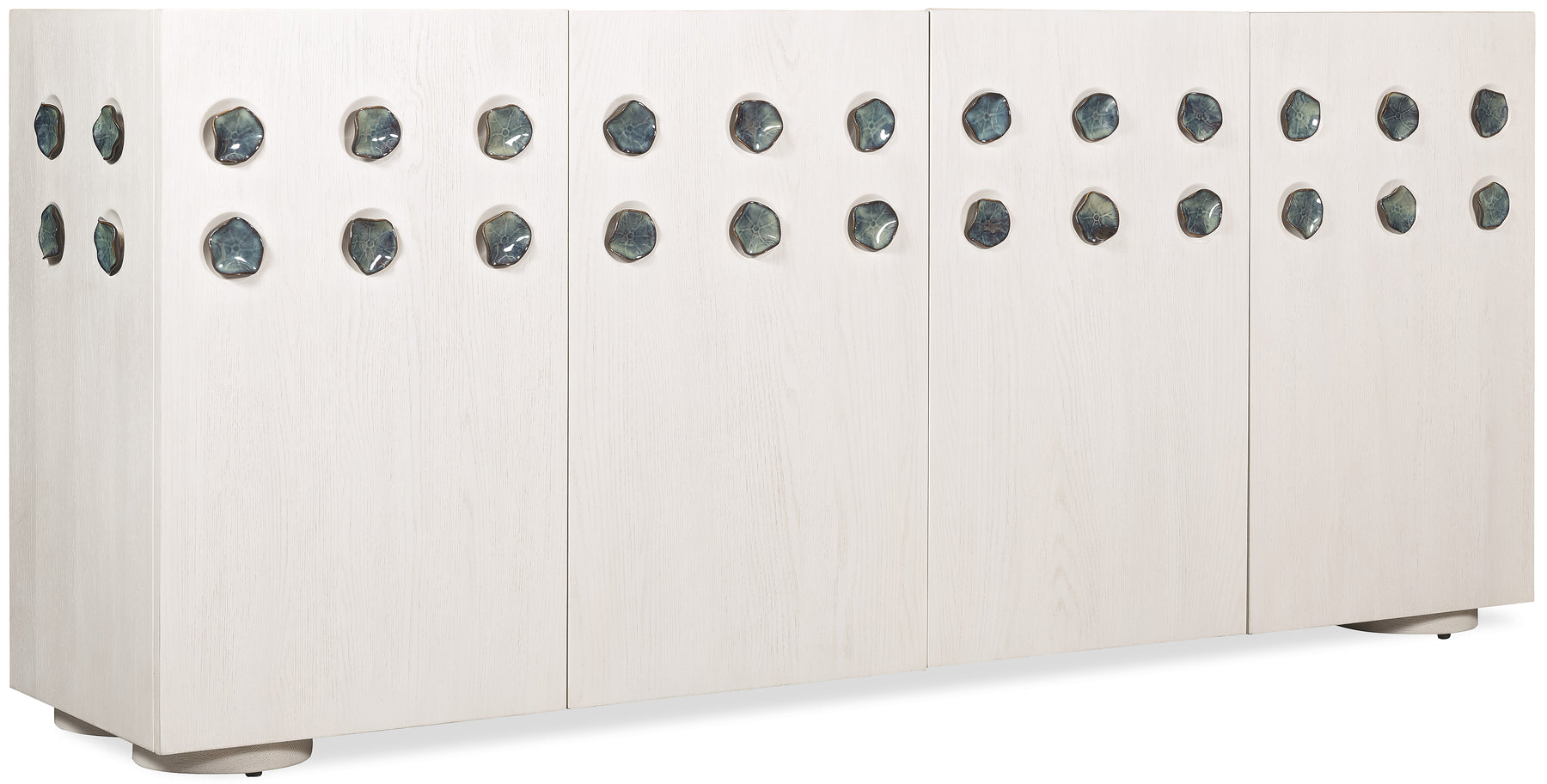 Art meets function in the Pilea Credenza, featuring lily pad-inspired green ceramic hardware and a crisp white oak finish. Soft-close doors, adjustable shelves, and wire management offer elegant home entertainment storage.