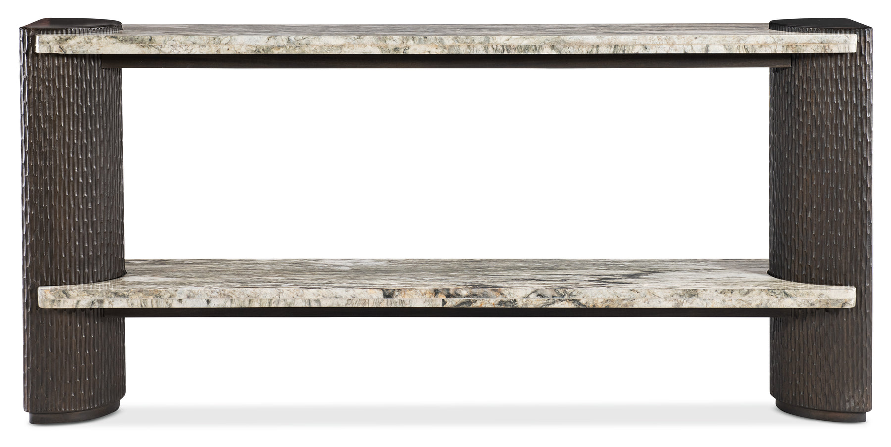 Marble top and shelf rest atop carved wood ends in this richly textured console table. Neutral tones of beige and gray create organic elegance.