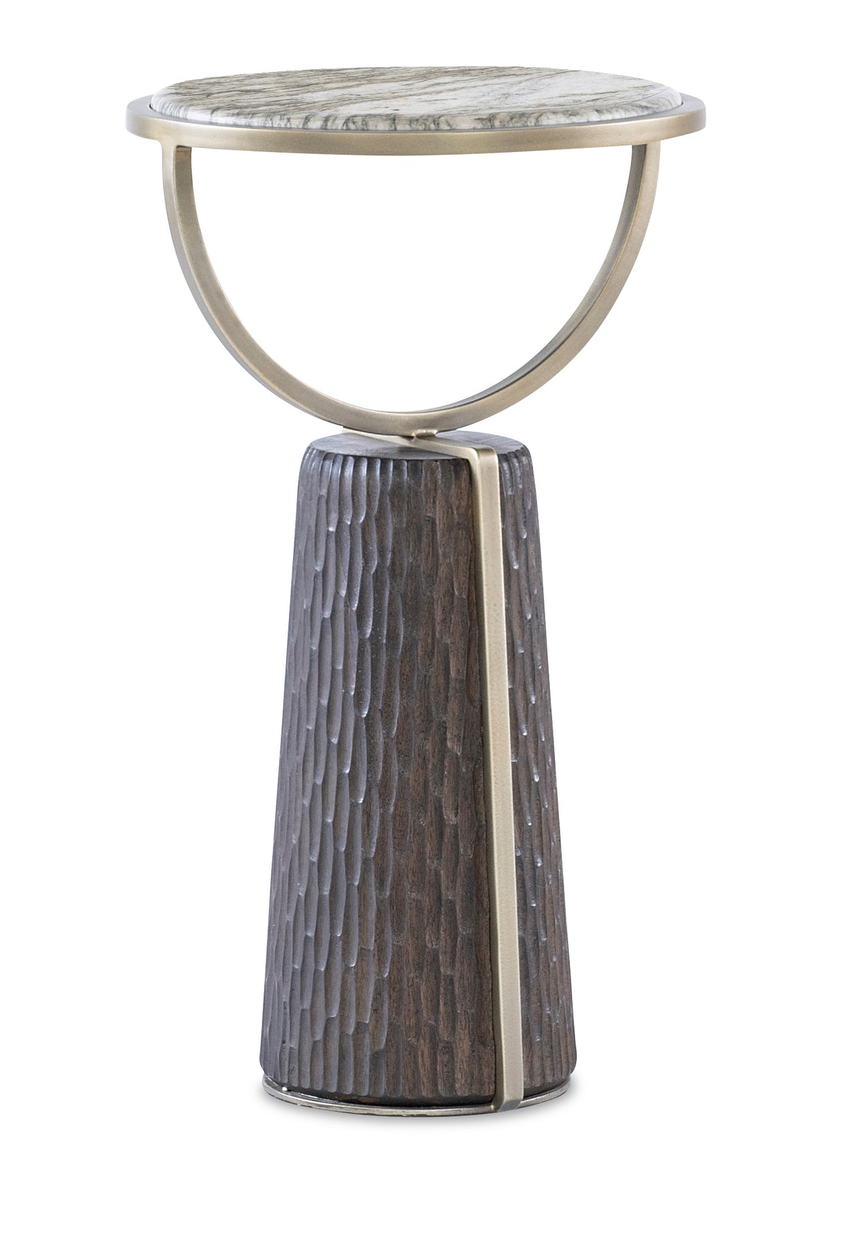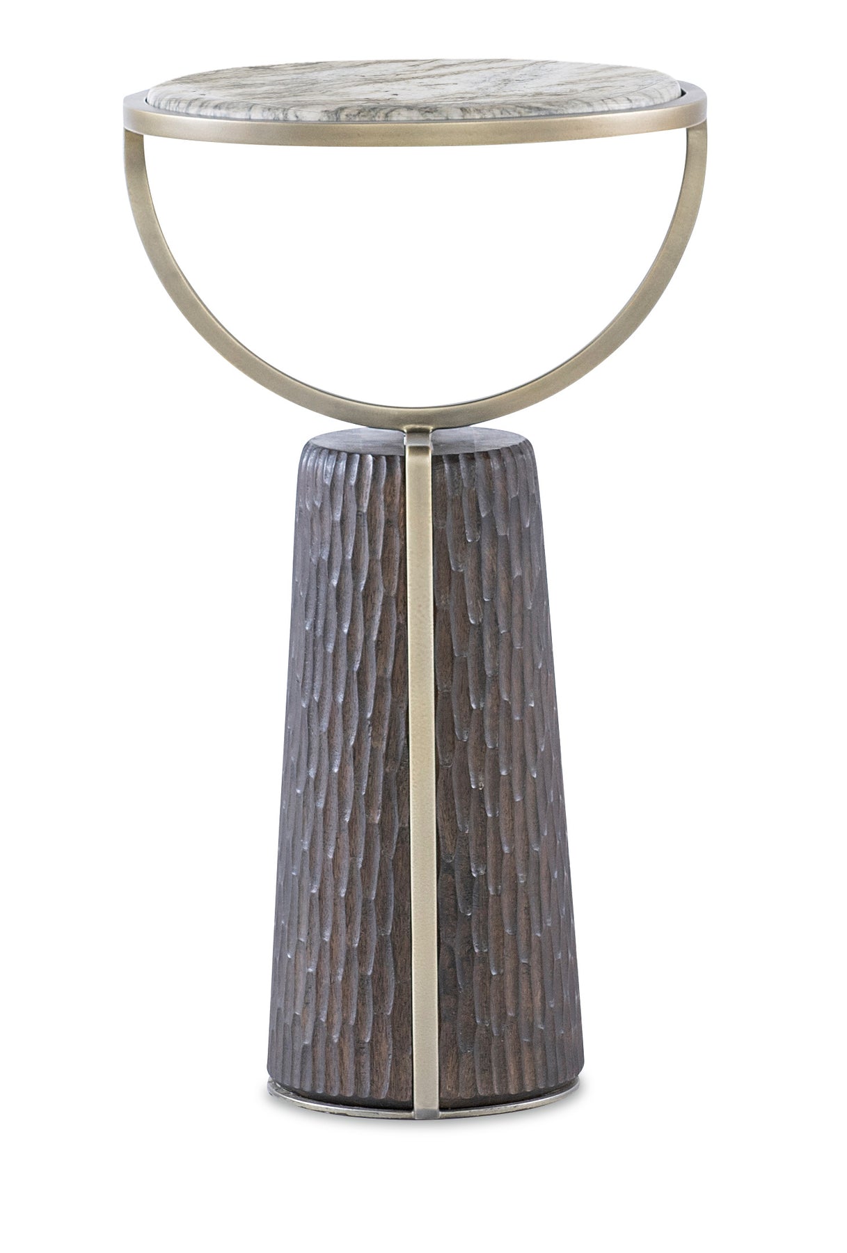 Compact yet artful, this round accent table pairs a carved wood base with a marble top rich in natural tones. Ideal as a side table for modern boho, earthy, or eclectic interiors.