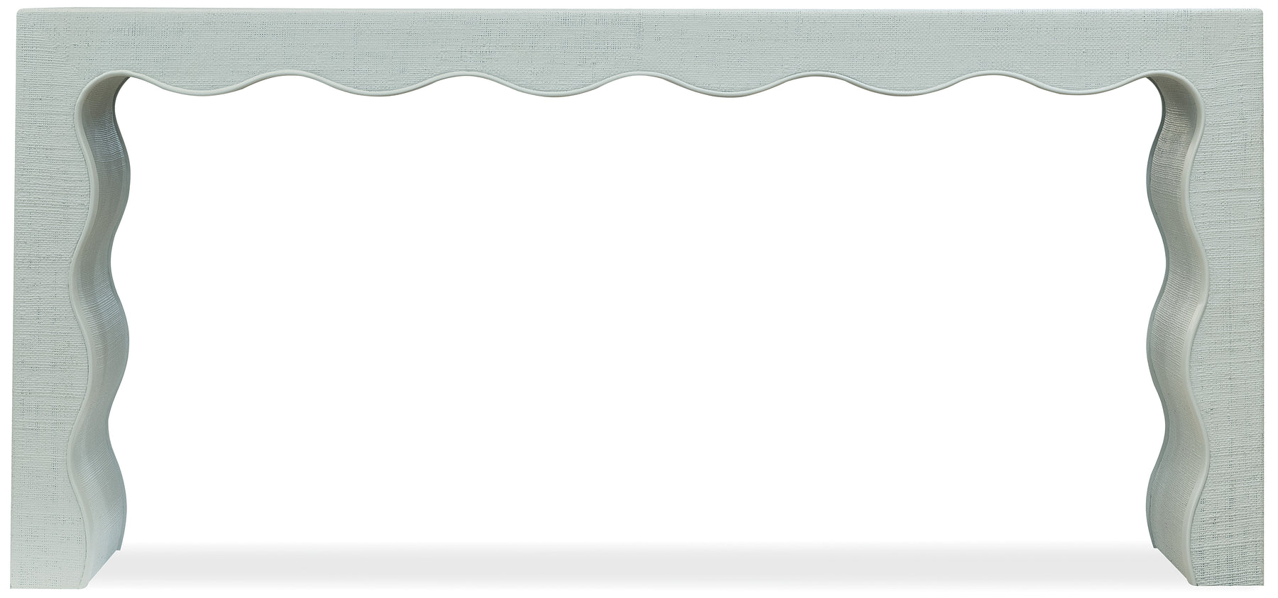 Wrapped in a blue-green painted raffia, this narrow console table makes a bold, coastal-inspired style statement with its scalloped design.