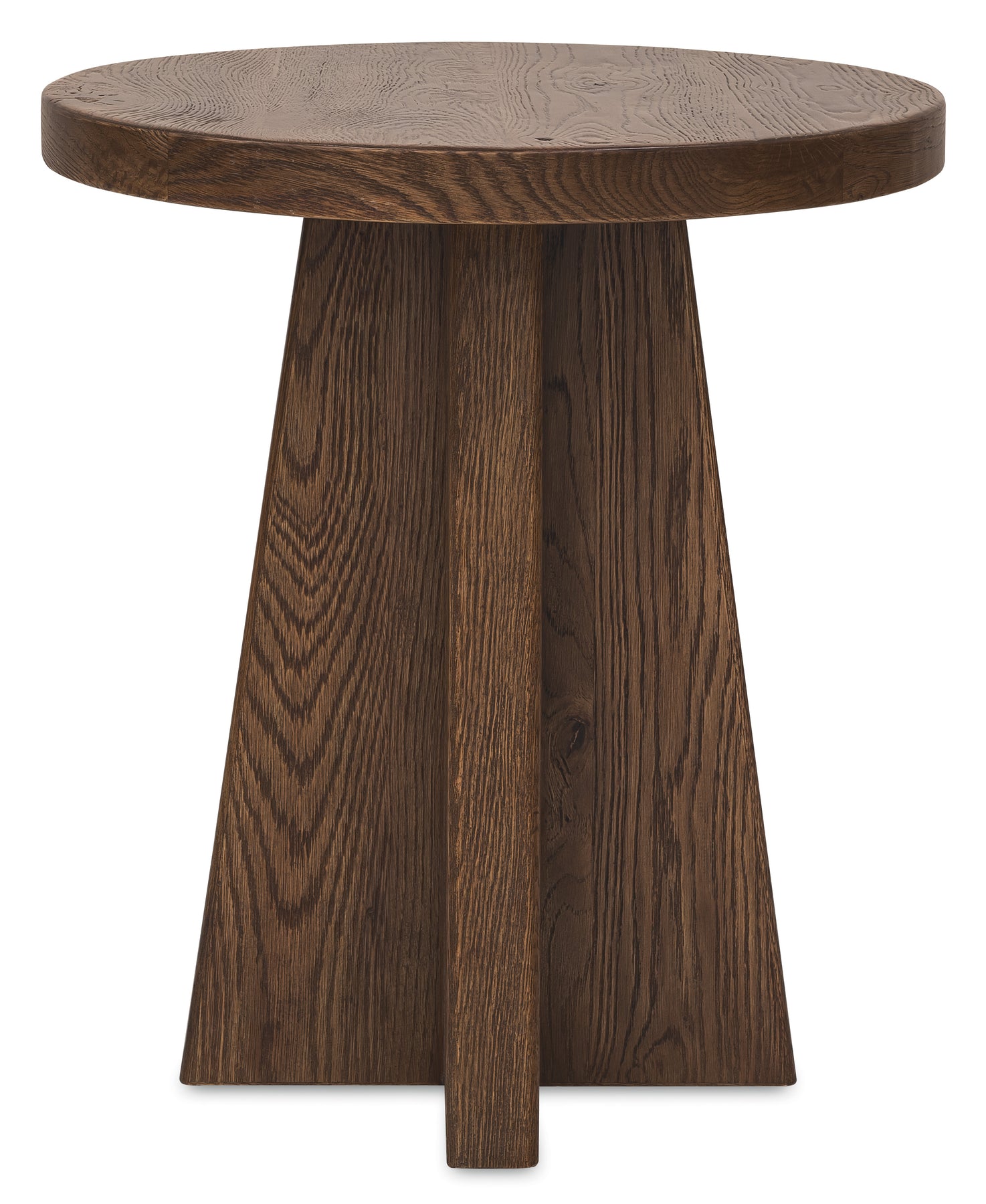 In a soft Buckboard finish, this round end table features a pedestal base and compact design, ideal for small spaces or as an accent piece. Made from oak solids and veneers, it reflects both quality and understated elegance.