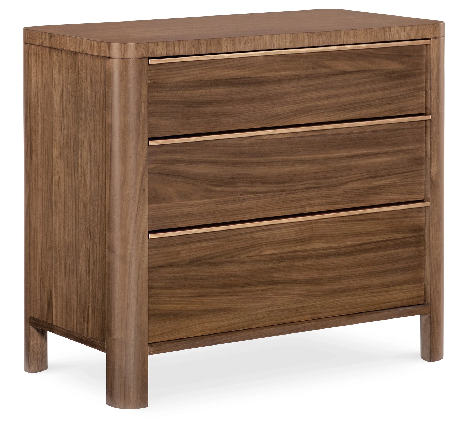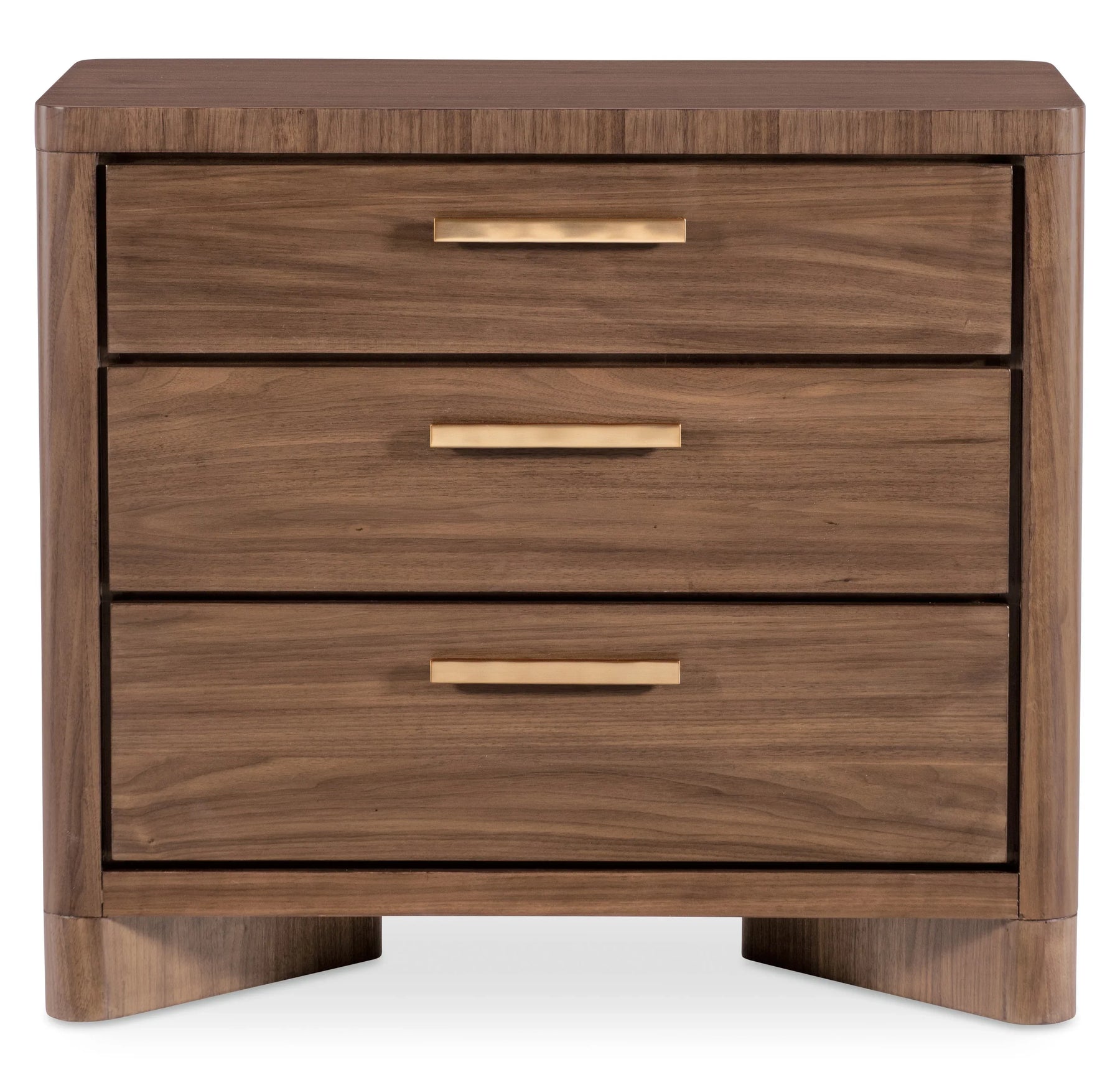 Designed for convenience and style, the Eleana Three Drawer Nightstand features Light Caramel walnut veneers, plated bronze hardware, and rounded corners. Its integrated charging station with dual outlets, along with three self-closing drawers, makes it both functional and luxurious for bedside storage.