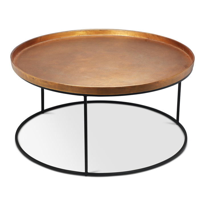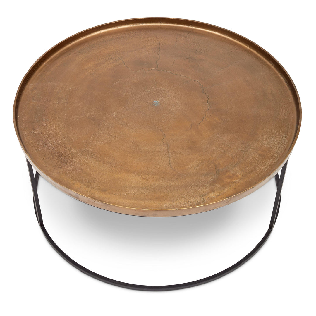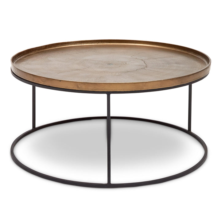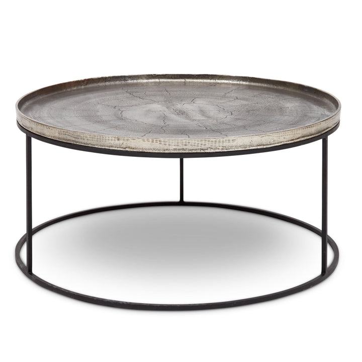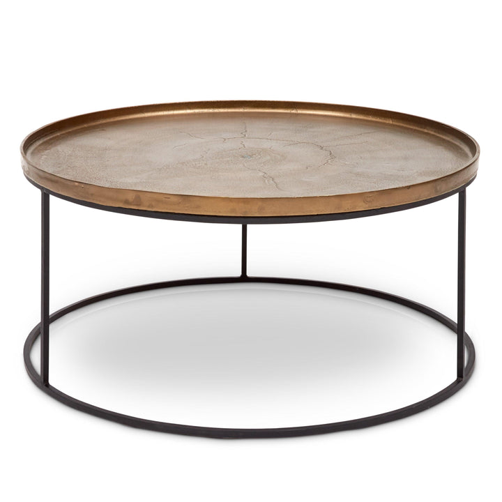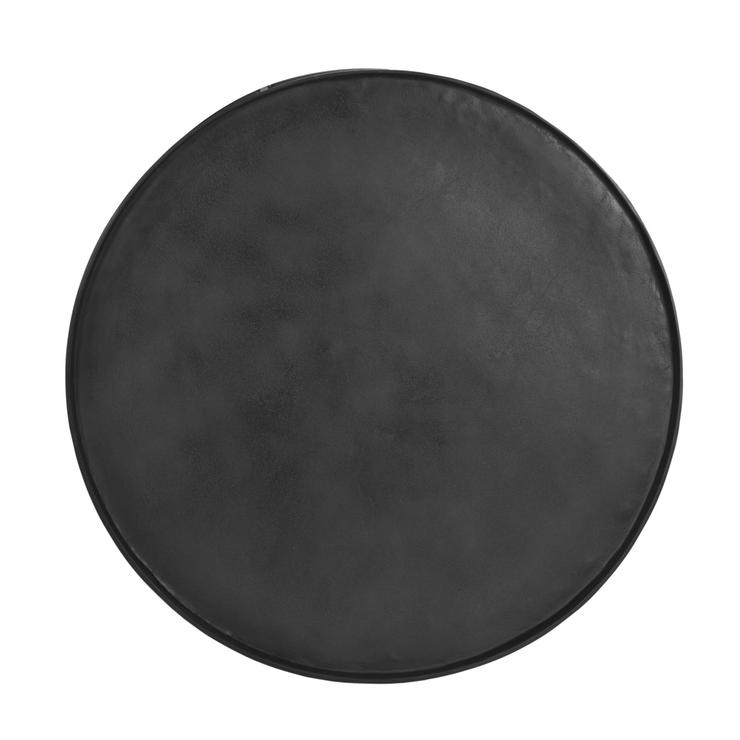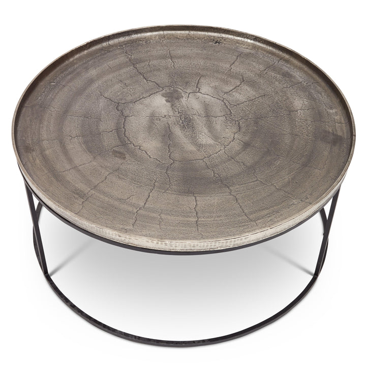 The Urbia Sana Coffee Table is handcrafted from reclaimed aluminum and recycled materials, offering a sustainable and eco-friendly choice for modern living rooms. Featuring a 34-inch rustic textured round top, this durable coffee table sits on three sleek legs connected by a hollow circular base, blending rustic charm with contemporary design. Perfect for adding character and long-lasting function to any living space.