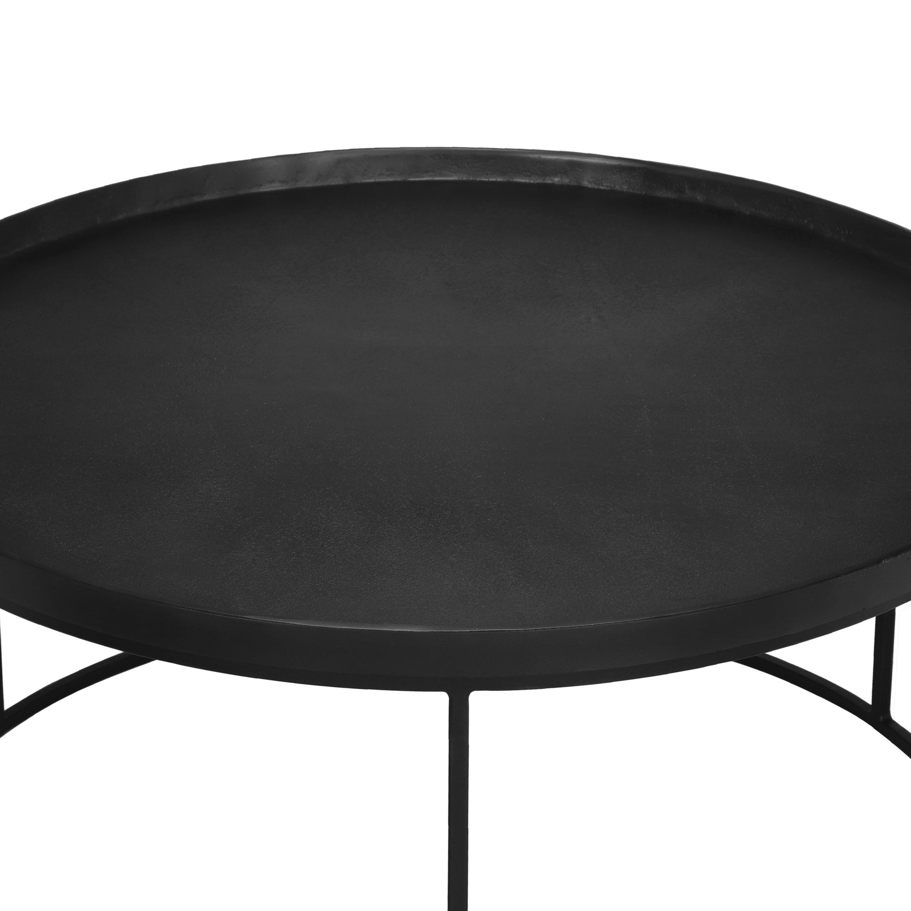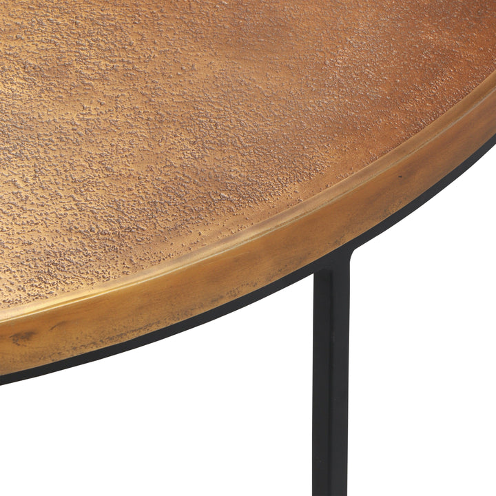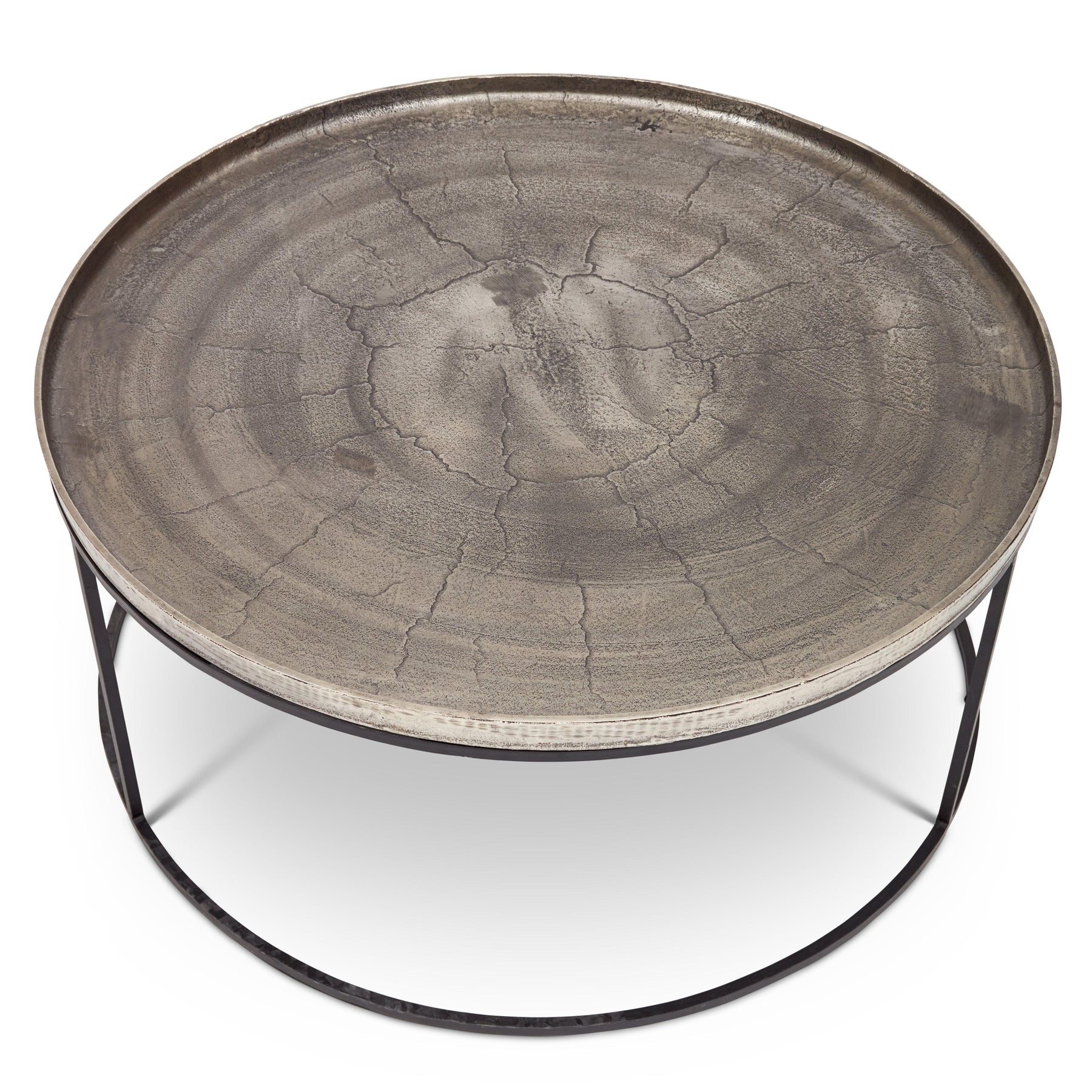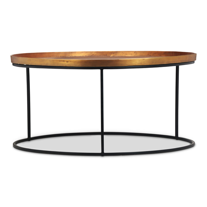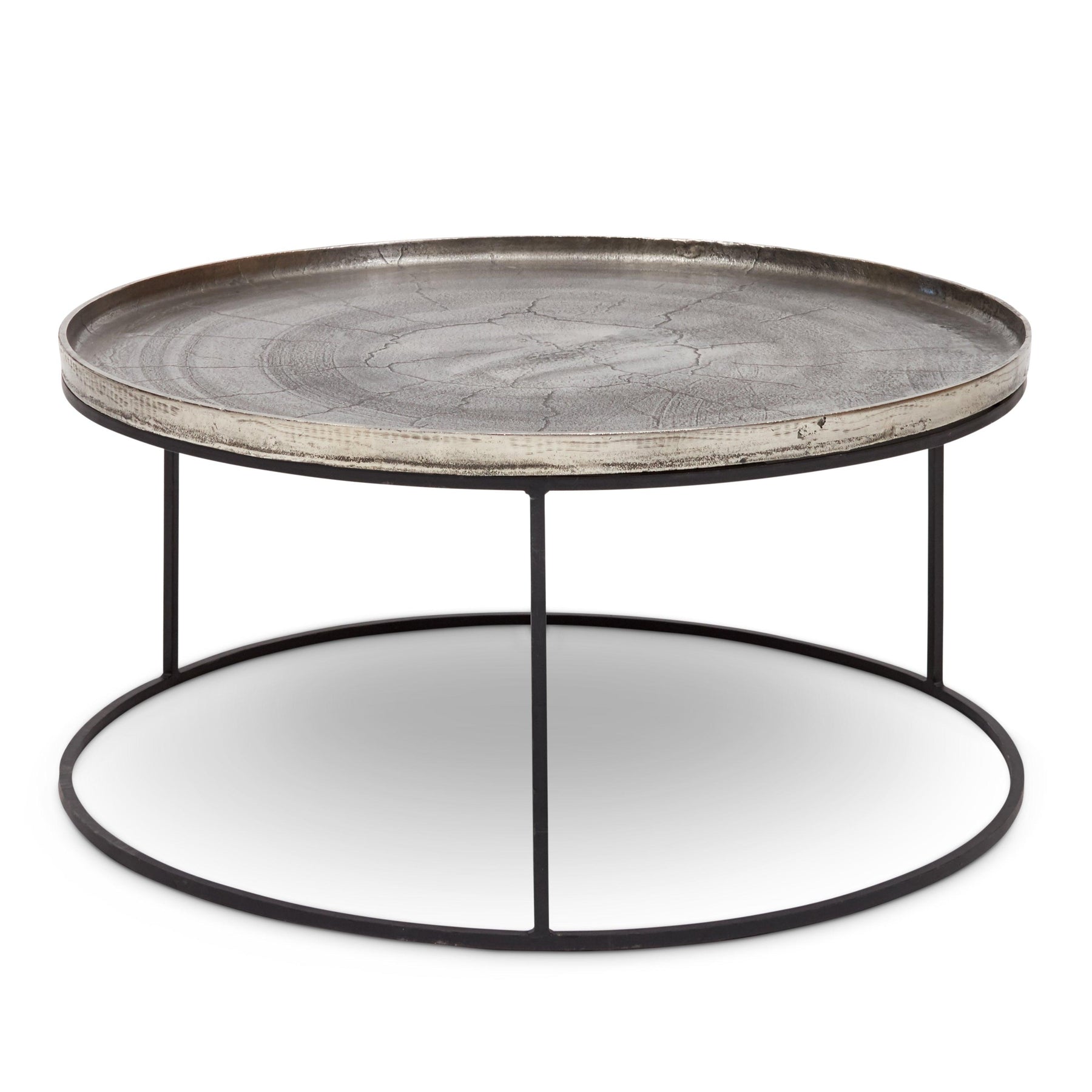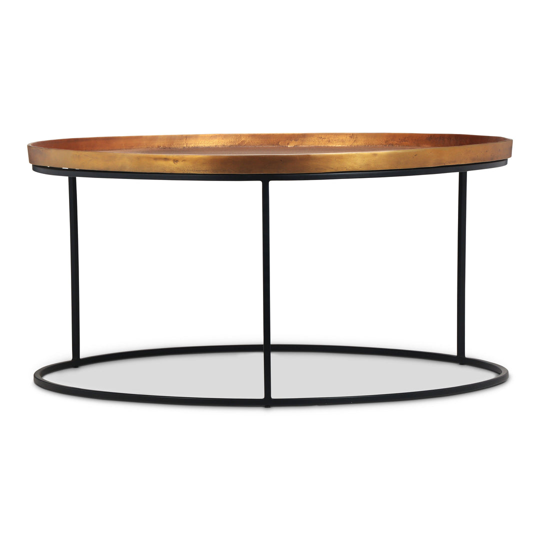 The Urbia Sana Coffee Table is handcrafted from reclaimed aluminum and recycled materials, offering a sustainable and eco-friendly choice for modern living rooms. Featuring a 34-inch rustic textured round top, this durable coffee table sits on three sleek legs connected by a hollow circular base, blending rustic charm with contemporary design. Perfect for adding character and long-lasting function to any living space.