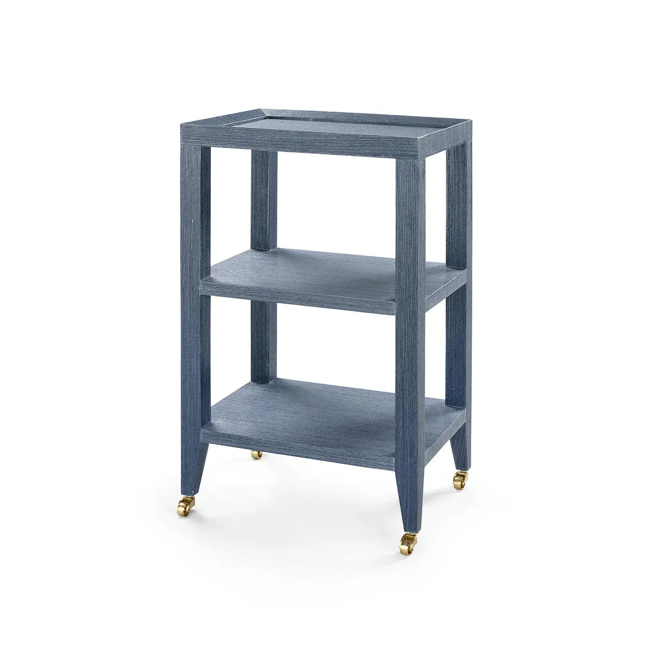 The Isadora Collection revisits old world luxury through a modernist lens, bringing structural furnishings to life with rich finishes, polished hardware, and a portable aspect that harks back to the golden age of entertaining, when pieces were rolled into parlors and drawing rooms according to one's needs. Of course, Villa & House has timelessness in mind when it comes to the likes of our Isadora Side Table, a longstanding staple of our collection. Featuring an open silhouette wrapped in lacquered navy blue grasscloth, stacked shelves, and a tabletop with a slightly inclined edge, the piece is ideal for everyday use or decorative display. Set on four brass wheels, the Isadora is glamorous yet practical, and can act as a versatile serving table or bar cart.