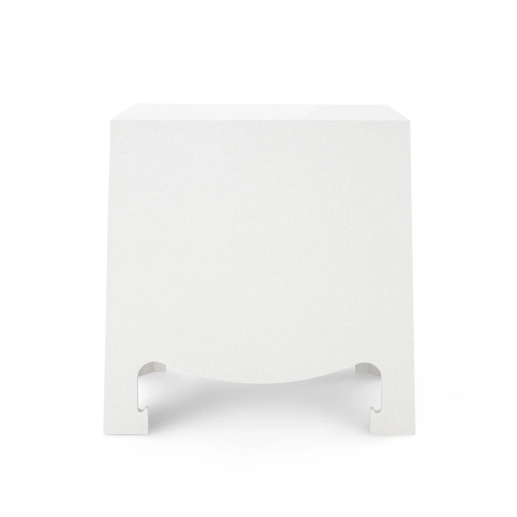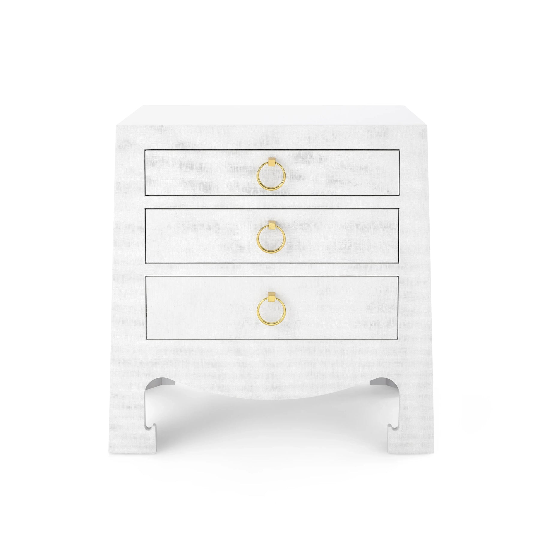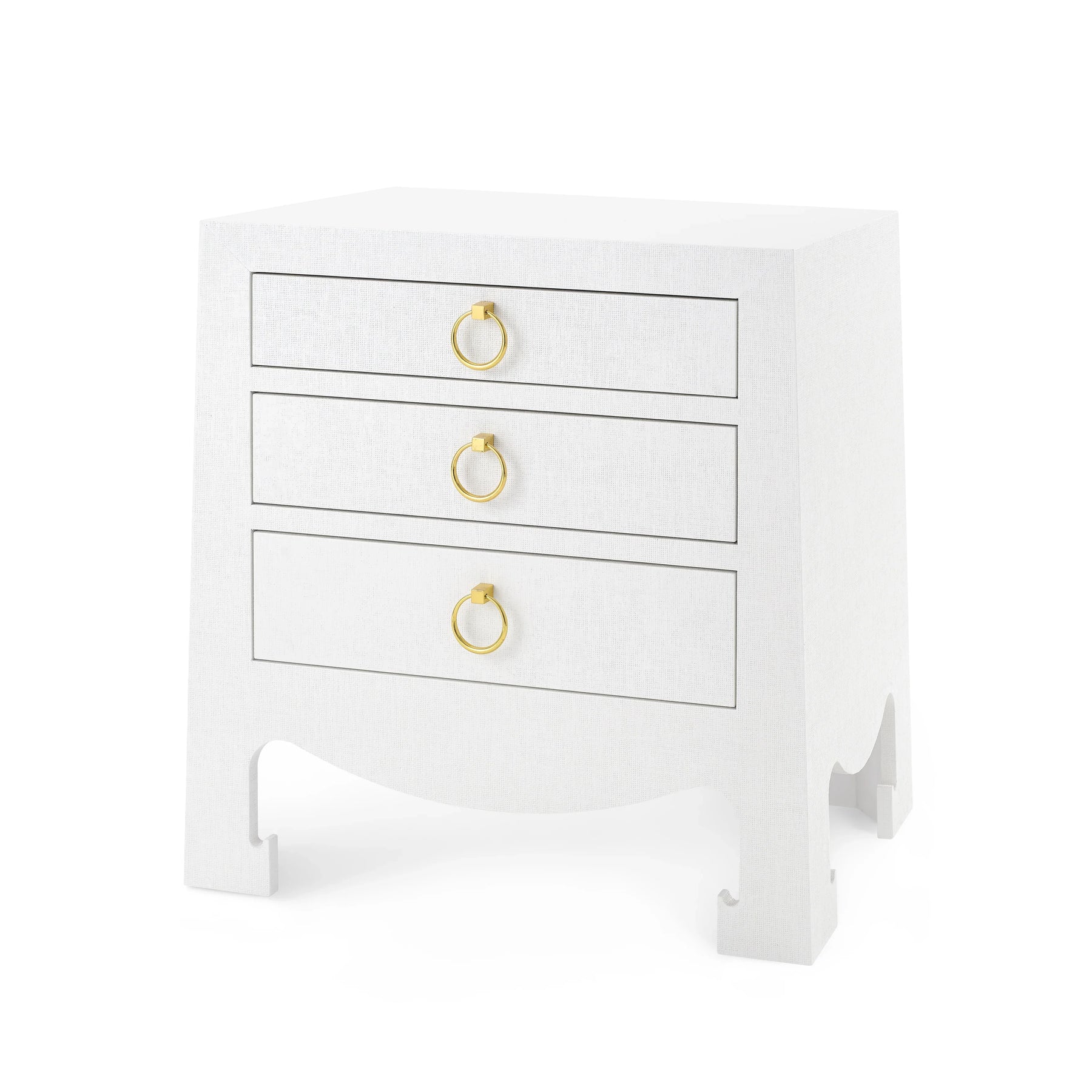 Fun, fresh, and a little bit funky, Villa & House's charismatic Jacqui Collection upgrades a room with glamorous flourish. A modern embodiment of opulent Hollywood Regency design, our Jacqui 3-Drawer Side Table features decorative wood-cut detailing, Chow-style curved feet, and subtly graduated drawers topped with glittering gold ring pulls. Realized in grasscloth with a white lacquer coat, the expertly-crafted piece is sure to play a starring role in any atmosphere, from traditional decor schemes to the more eclectic. Whether flanking a sofa or California King bed, the Jacqui's presence instantly whisks you away to a scene straight out of classic Hollywood.
