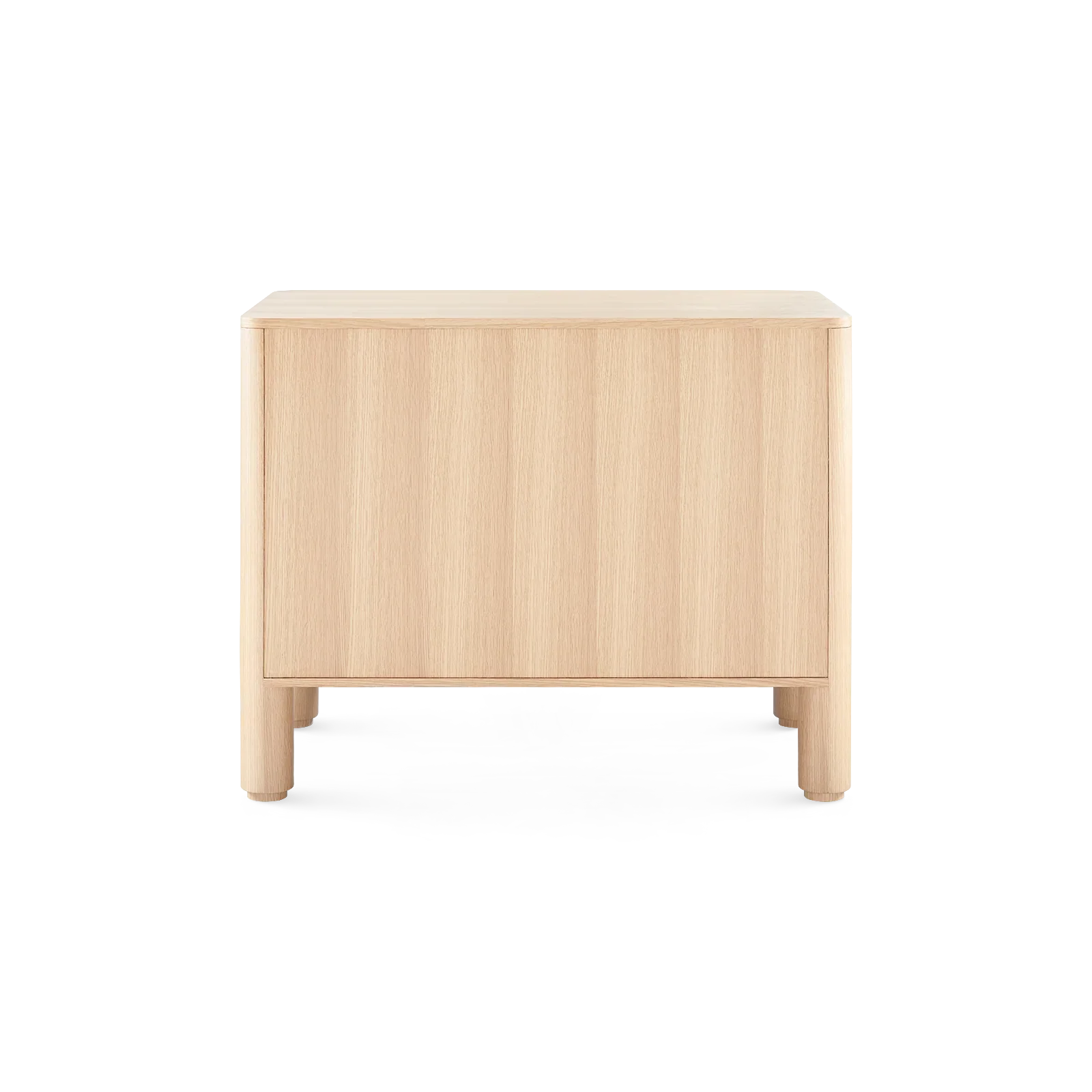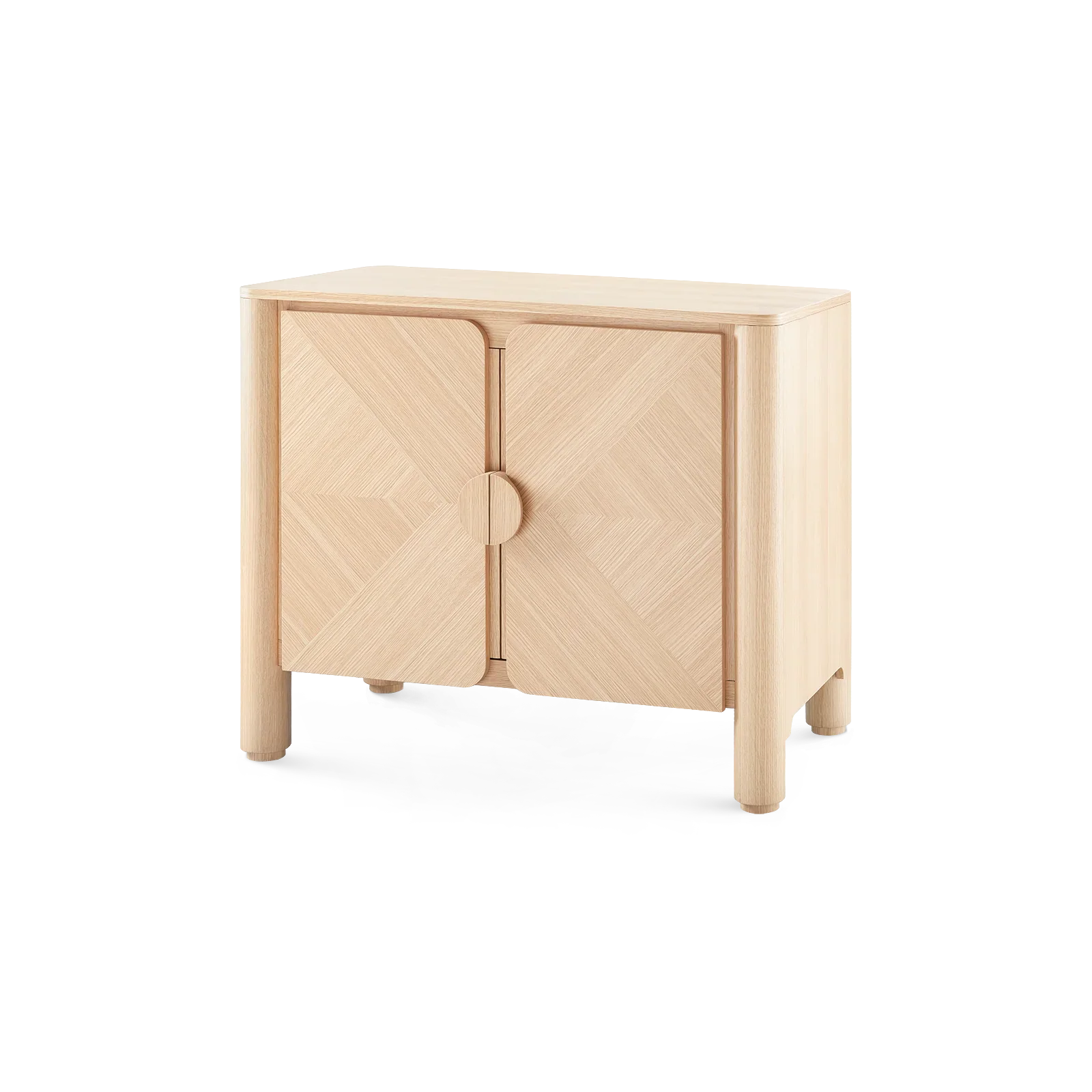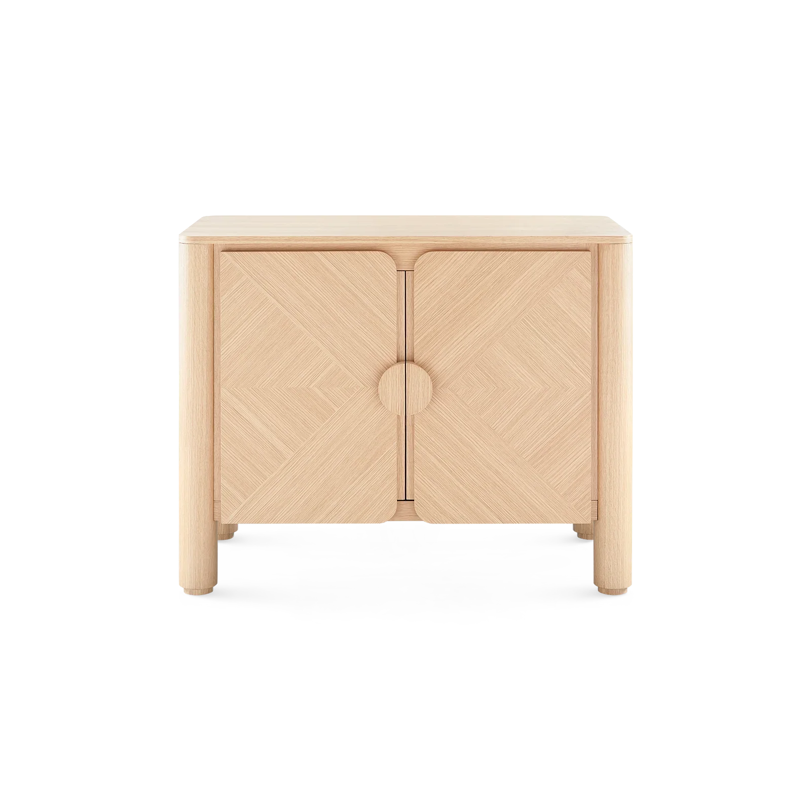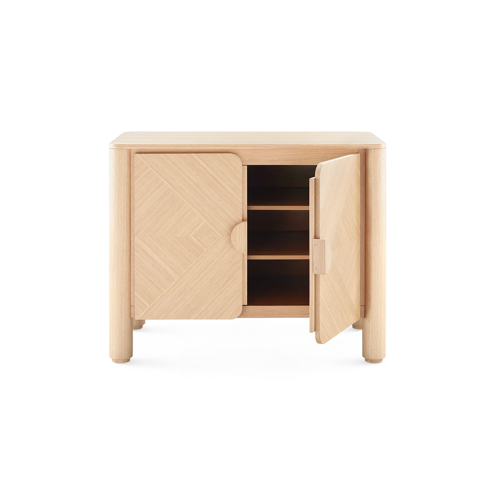The Nolan Cabinet is expertly crafted from European white oak veneer with a sleek clear lacquer finish. Its bold, curved, and chunky elements draw inspiration from 1970s-80s California design, offering a retro yet refined look. The front showcases a stunning chevron wood grain pattern, adding a texture and a touch of refinement. Resting on recessed feet, this cabinet blends retro charm and modern functionality.