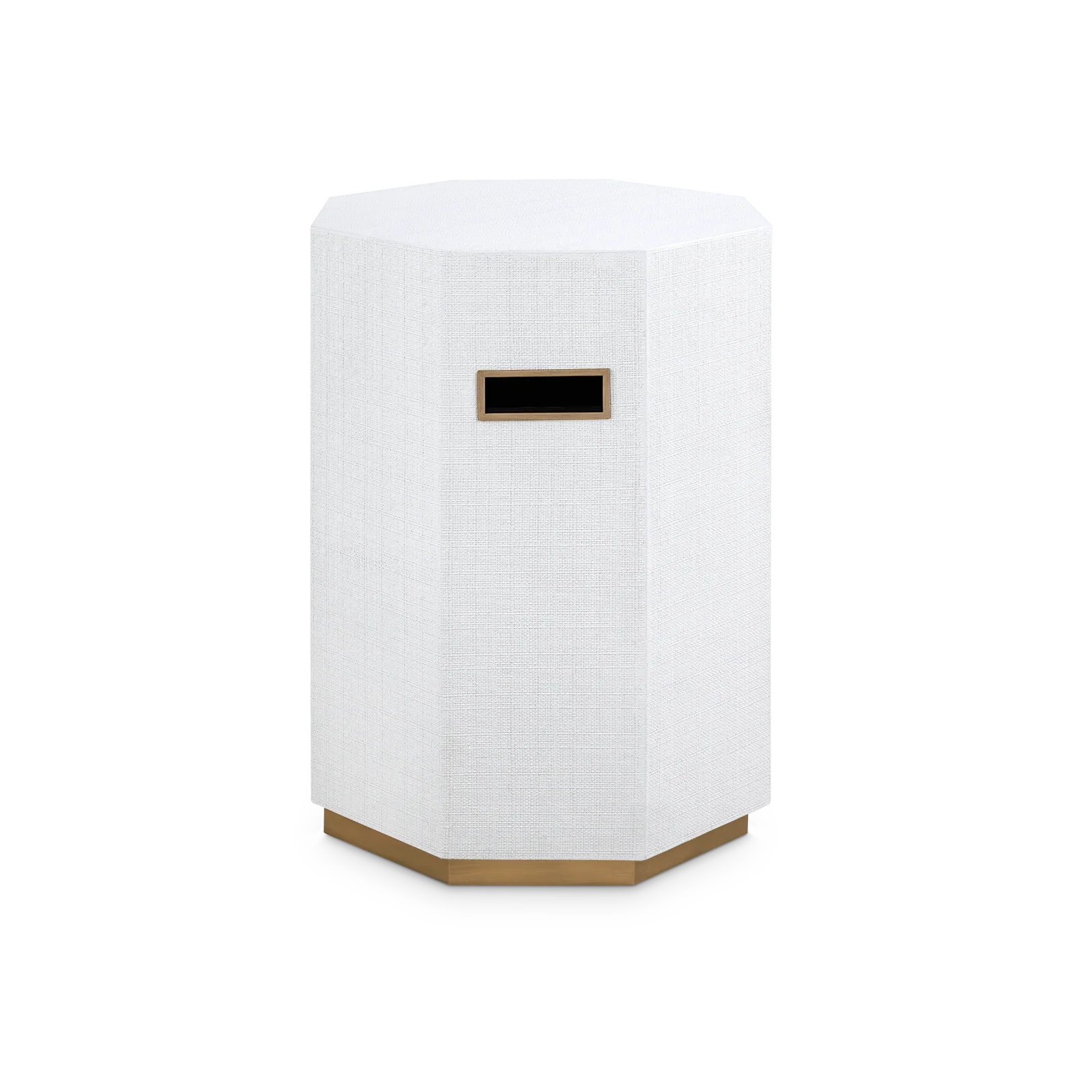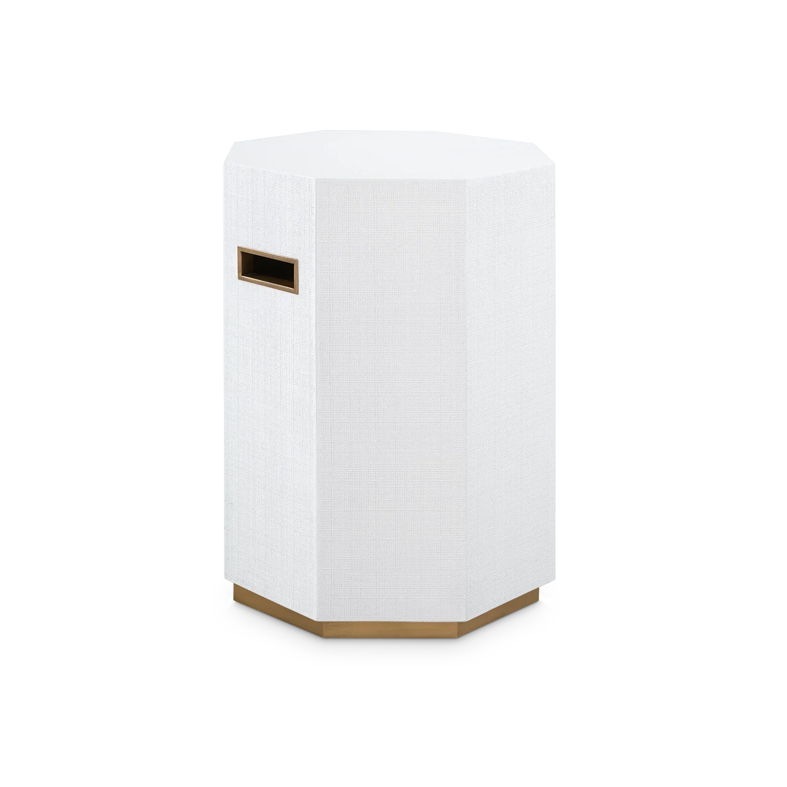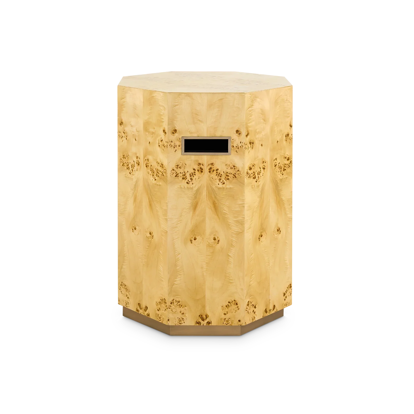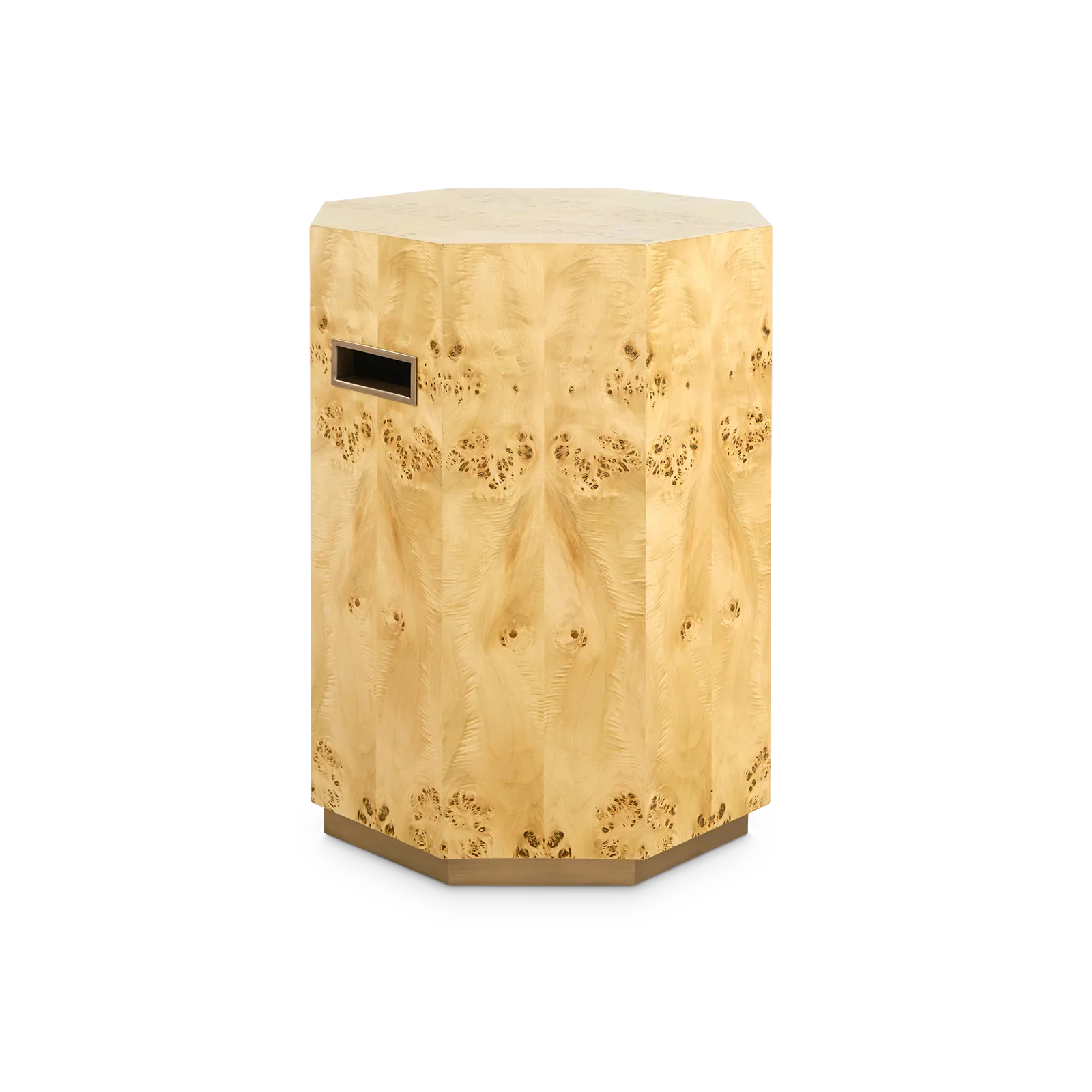 The Octavia Side Table fits anywhere in your home with beauty and versatility. Our designers created this piece to be used as both a small side table and a low stool. A brushed-brass base and set of handles make it easy to move around your space as needed. The look and feel of this piece highlight simplicity: the sharp, geometric lines and custom-made brass accents offer a modern touch, while the option of a lacquered linen or burlwood veneer finish adds the element of luxury. With the variety of colors and finishes to choose from and its petite size, the Octavia can adapt to any room.