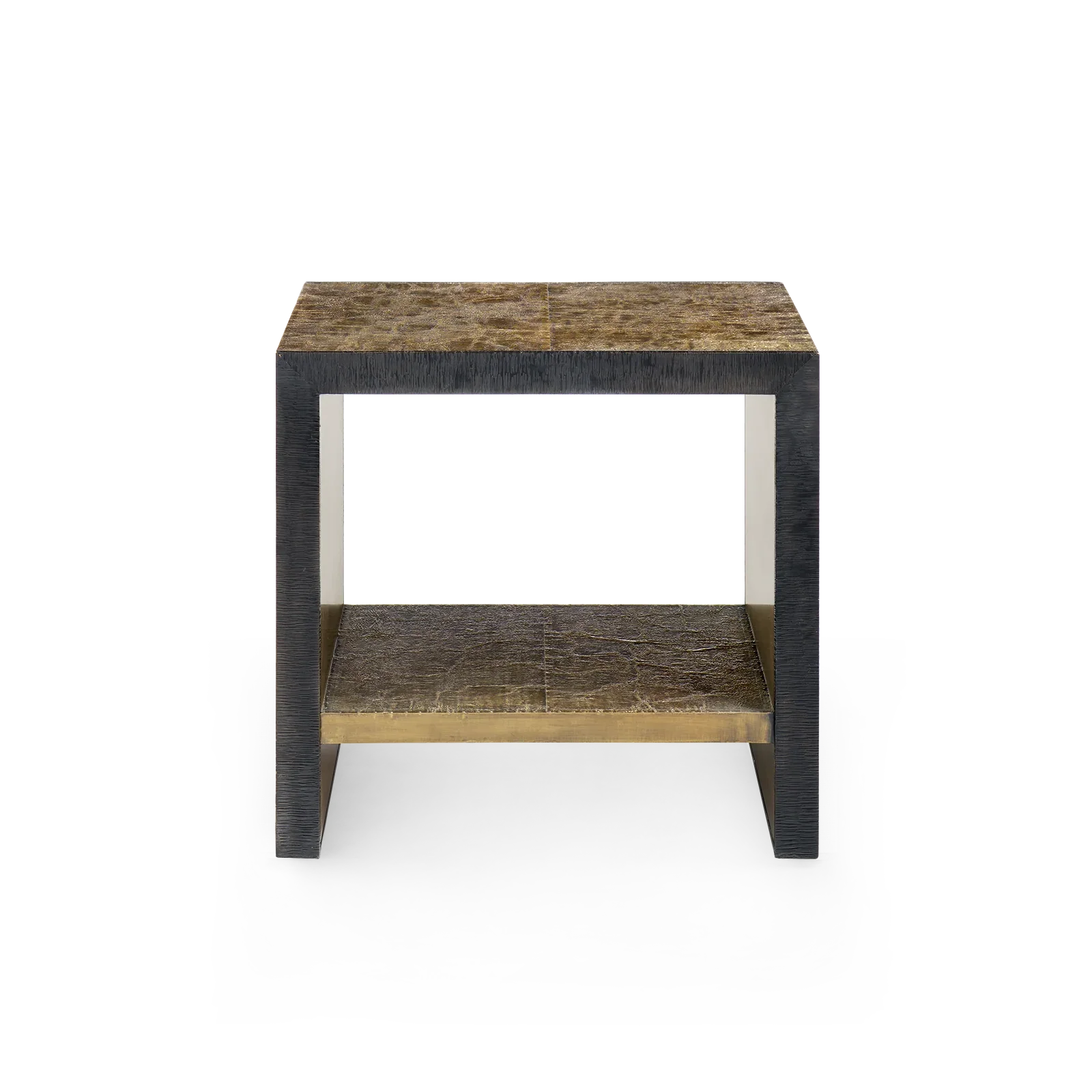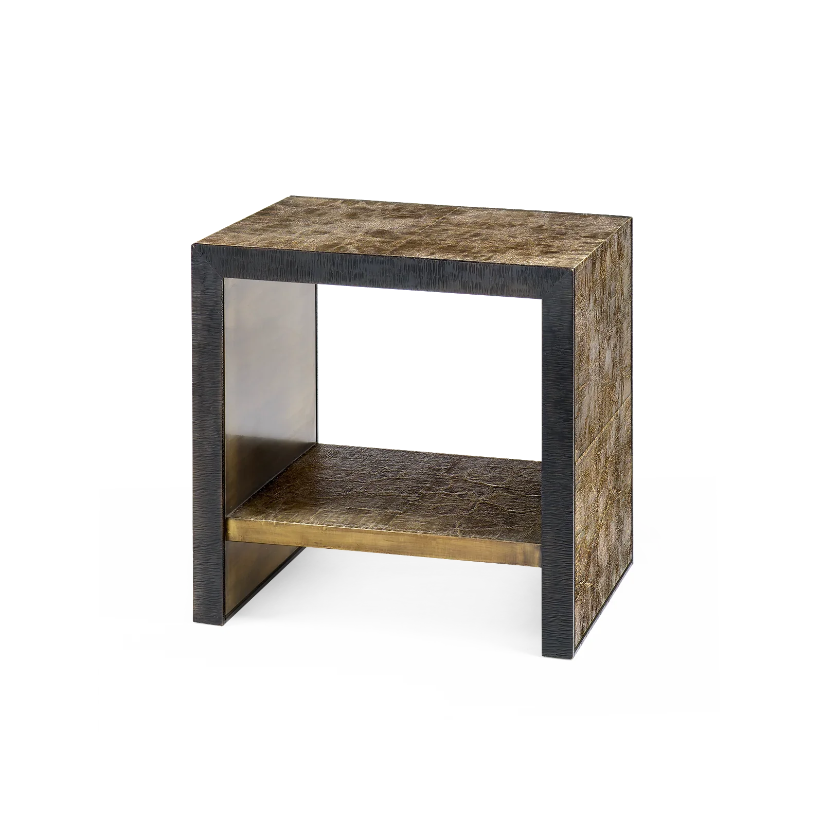 Sophisticated warmth meets contemporary design in our Odeon Side Table. Its sleek profile has modern, minimalist appeal, while elemental finishes and meticulous metalwork elevate the piece for high-end tastes. We can thank Villa & House’s expert craftsmen for that. Their creative touch can be found in the treatment of the antique brass cladding, which covers the Odeon in a tactile pattern that feels organic while resembling naturally aging metal. Its interior plane presents the brass with a smooth finish. The Odeon features a fixed shelf, solidifying its geometric silhouette and serving as the perfect showcase for an art piece or stack of books. It’s a handsome accent next to a lounge chair or sofa.