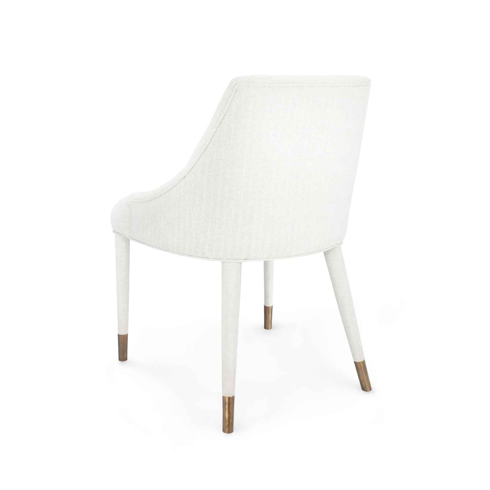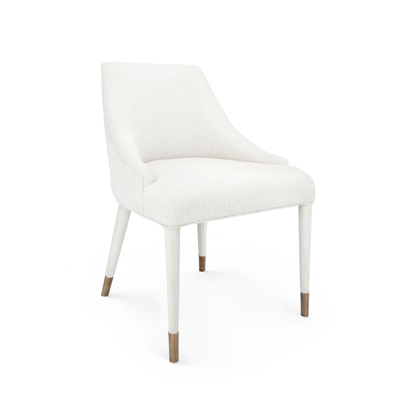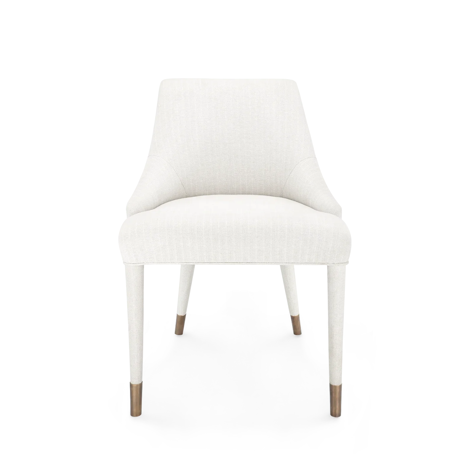 Softness and structure are delivered in equal measure in the Odette Armchair, a comfortable piece to show off as an accent or use as a set around a dining table. Wrapped in head-to-toe natural linen with a subtle herringbone design, the Odette radiates quiet elegance with a textural nod to the organic. The gentle curves and fluffiness of its silhouette are anchored by four rounded legs, capped in bronze. The angled positioning of the two back legs recall mid-century modern design, giving the piece a retro aesthetic that’s timelessly chic. Curl up with a book or sit back and enjoy a meal with friends and family. No matter where you choose to place the Odette, its cosmopolitan presence is sure to impress.